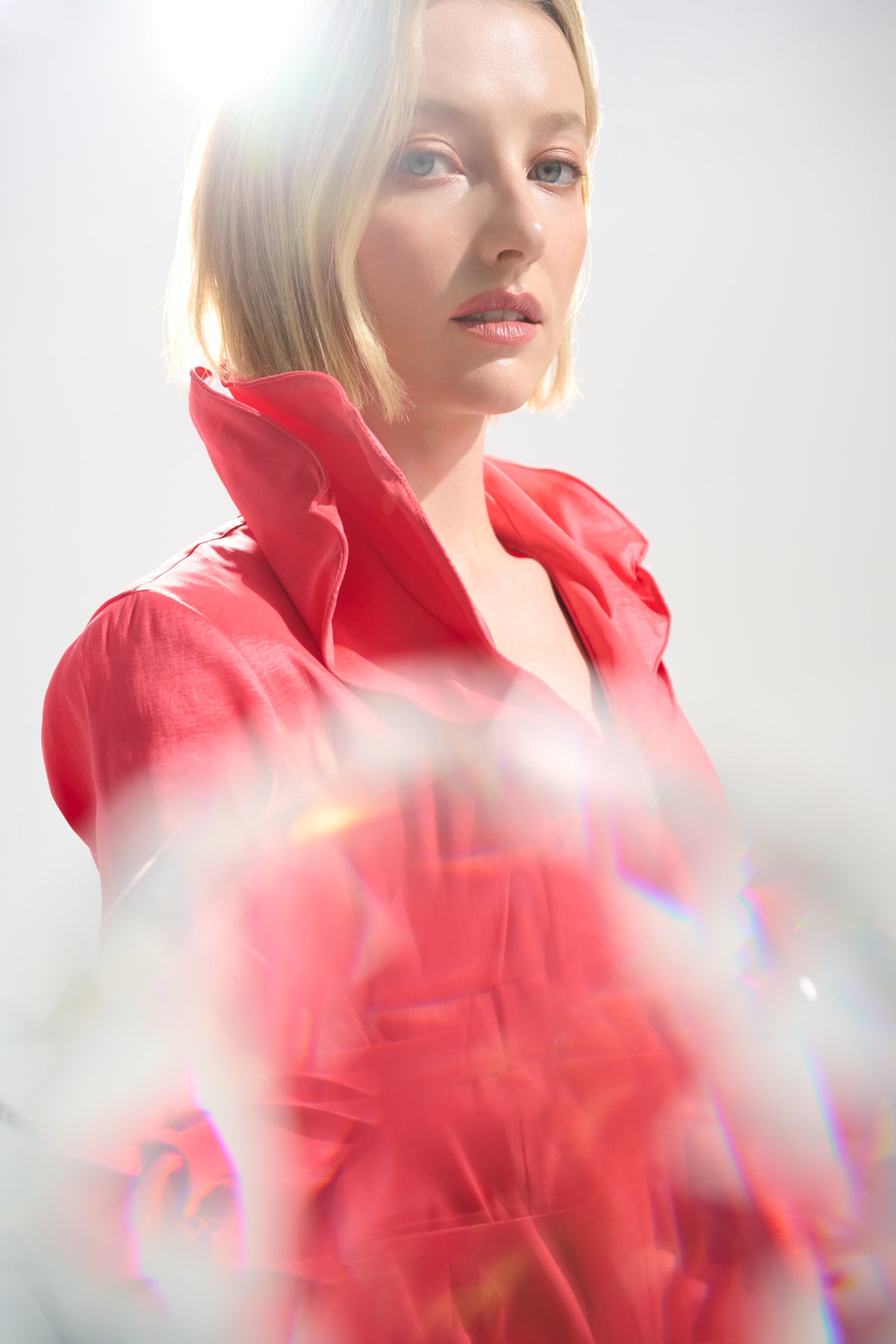 This stretch taffeta dress combines structure with softness, showcasing a wired double lapel collar, a flattering waist sash, and a pleated skirt. The rhinestone zipper pull adds an elegant detail to its bold shape. Featured in the Signature collection, it’s designed to make a stylish statement.