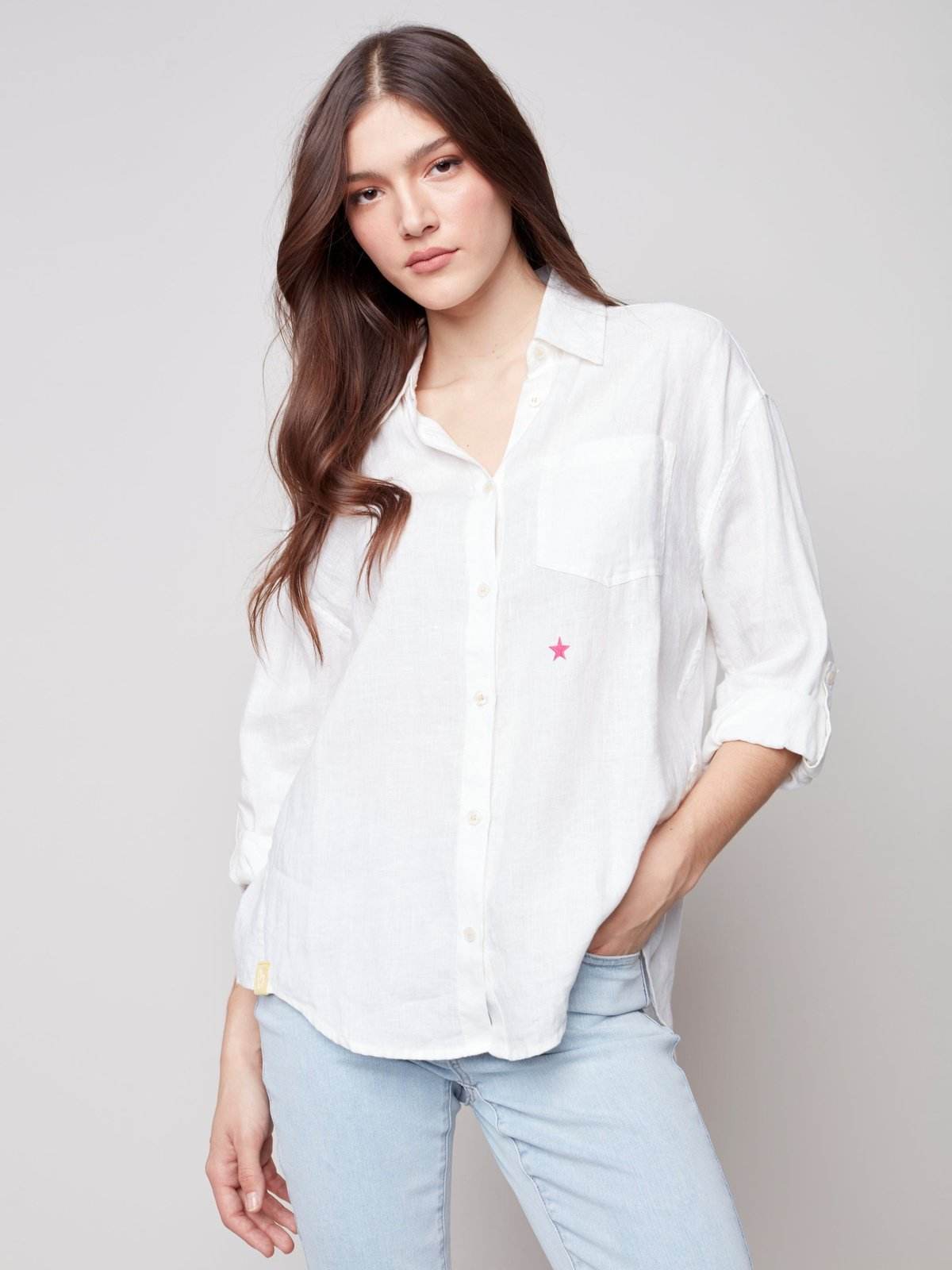 Our Long Button-Down Tunic Blouse is your go-to piece for effortless style and supreme comfort! A beautiful addition to your Spring/Summer wardrobe rotation with a star print on the back, drop shoulder, roll-up sleeves and side seams forward detail!