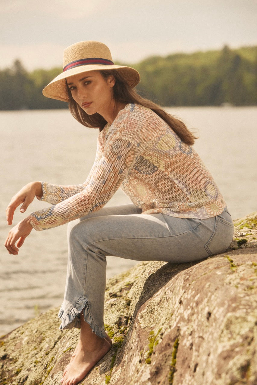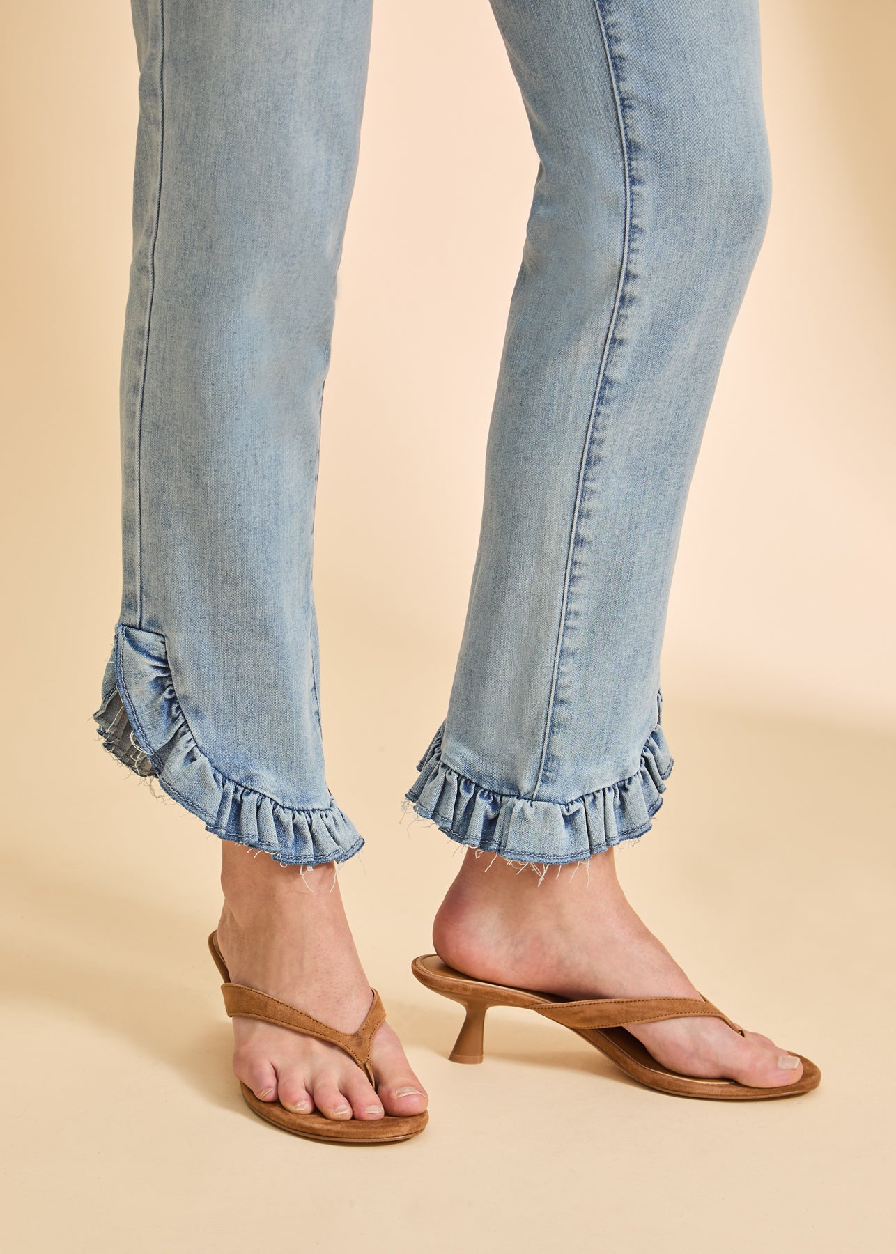 Slim-leg jeans with a charming ruffled hem and soft stretch denim for all-day comfort. The flattering fit through the hip and thigh, combined with classic five-pocket styling, makes these a versatile staple. Perfect for dressing up with blouses or keeping it casual with tees.