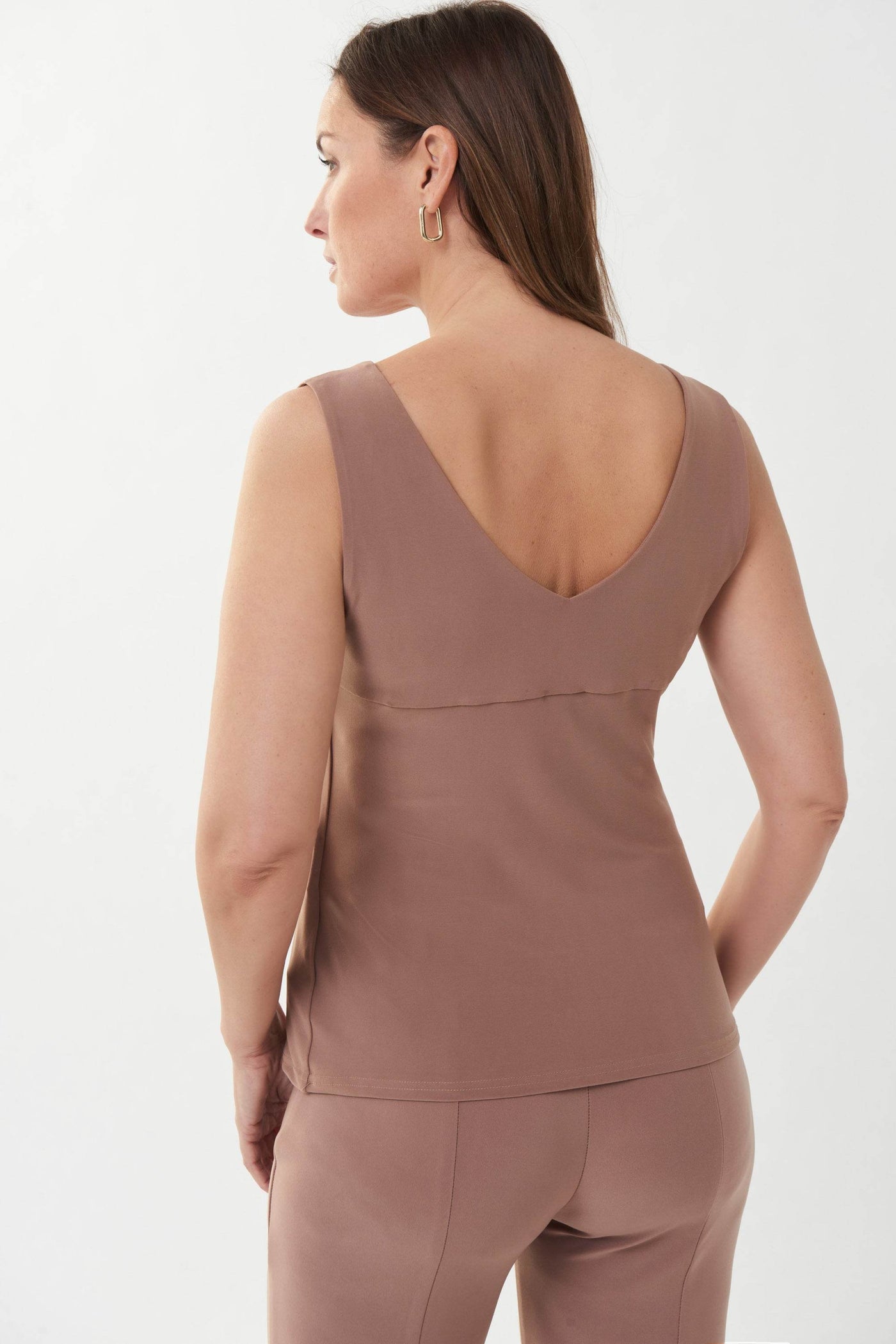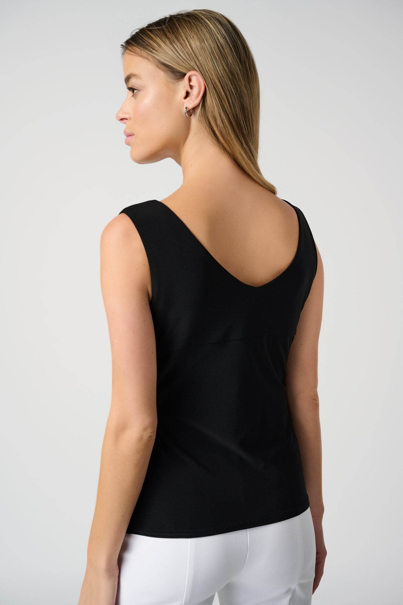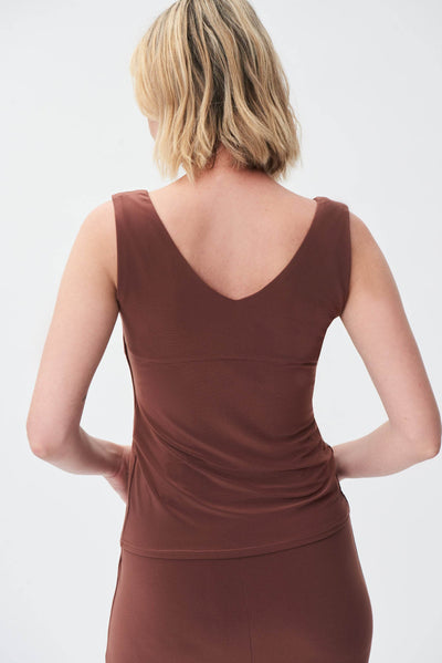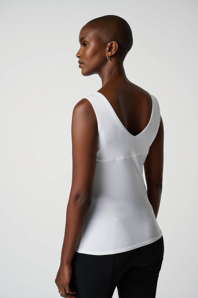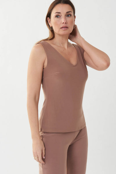 This sleek camisole offers a silky knit featuring a V-neckline on both the front and back of this garment. It has a shoulder-baring silhouette and a double-layered front, making it a chic, must-have basic.