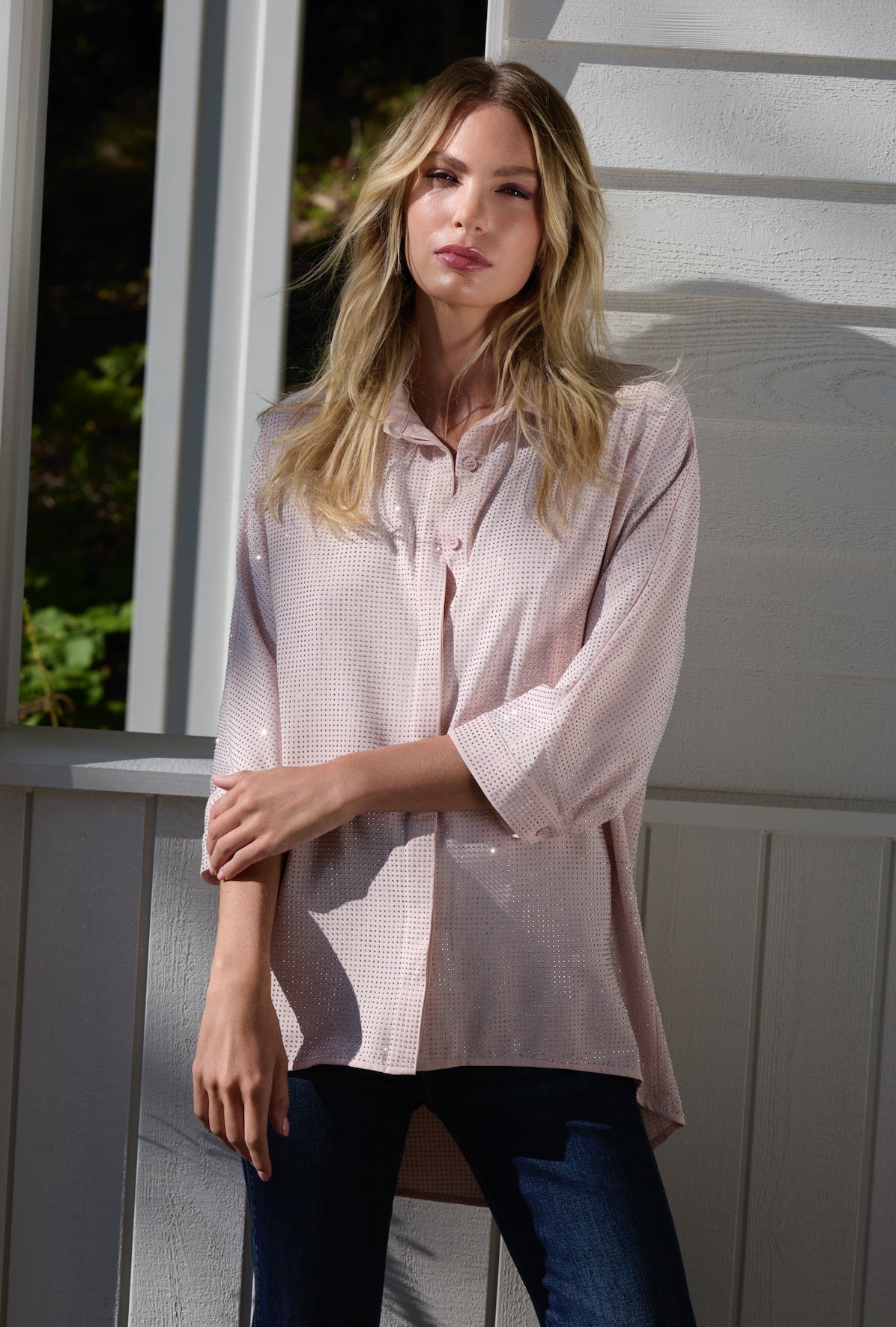 Lightweight and breathable, this perforated button-down delivers understated sophistication. The soft blush hue, relaxed fit, and three-quarter sleeves create an effortlessly polished look that transitions seamlessly from day to evening. Hidden placket detailing adds refinement, while the airy fabric makes it ideal for layering or wearing solo.