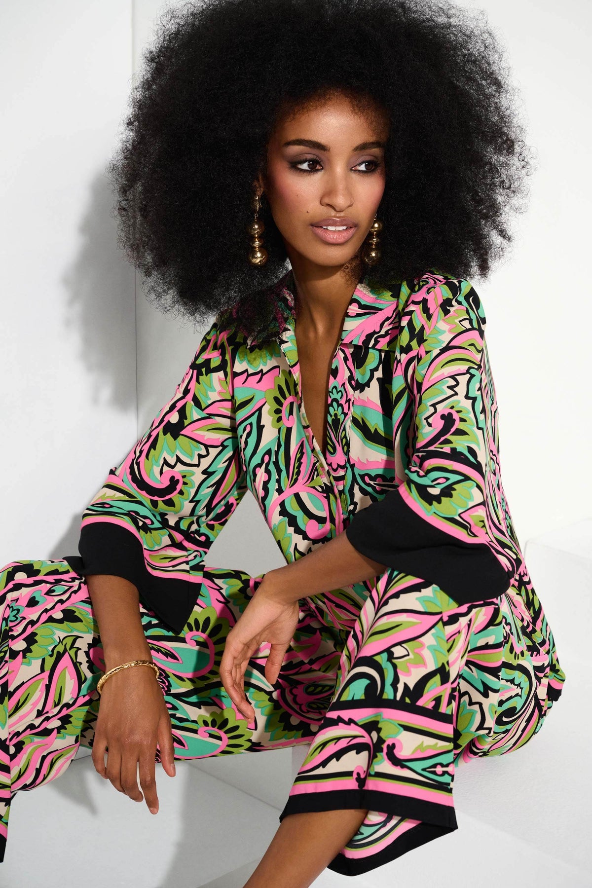This woven top captures the essence of bold contemporary style. This garment presents a captivating paisley print highlighting the design’s unique artistry. A sleek shirt collar and three-quarter sleeves with contrasting cuffs complement the boxy silhouette’s refined look. The delicate side slit adds extra flair to this exquisite piece.