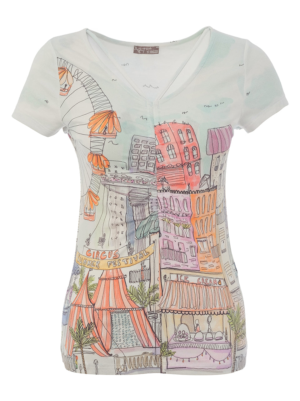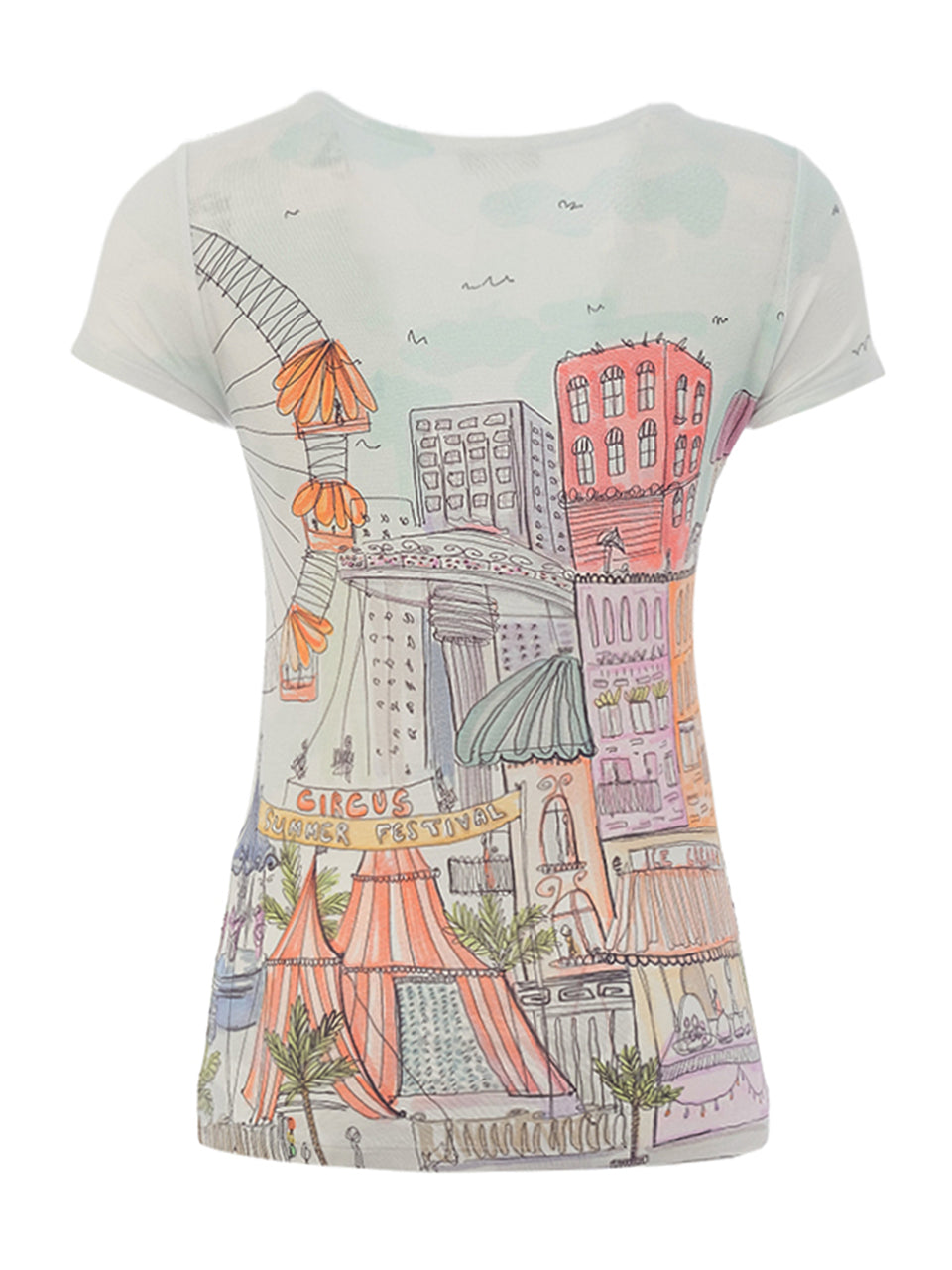 A playful expression of art and color, this fitted tee brings the charm of a hand-drawn cityscape to life. Designed with soft stretch fabric for a flattering silhouette, it features an artistic sketch print accented with vibrant citrus-inspired tones. The classic scoop neckline and short sleeves make it an easy everyday piece, while the detailed illustration adds a unique, gallery-worthy feel. Perfect for pairing with denim or crisp white bottoms for a fresh, creative look.