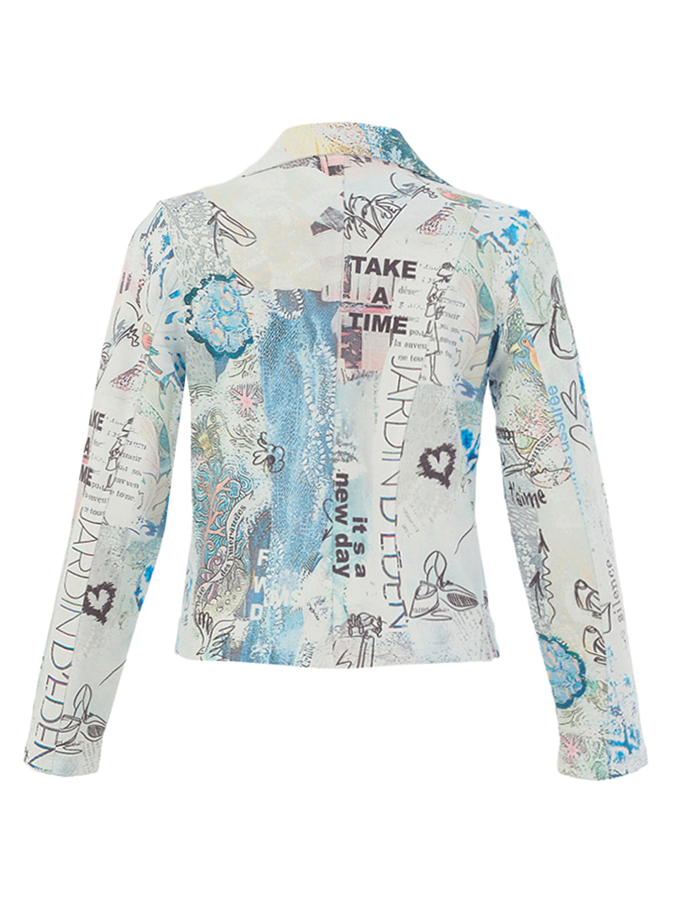 A statement moto jacket featuring an expressive collage-inspired print that blends artistic sketches with modern graphic elements. Designed with an asymmetrical zip front, structured lapel, and a flattering tailored fit, it adds instant edge to any outfit. Lightweight and versatile, it layers effortlessly over everyday essentials while bringing a bold, creative finish to your look.