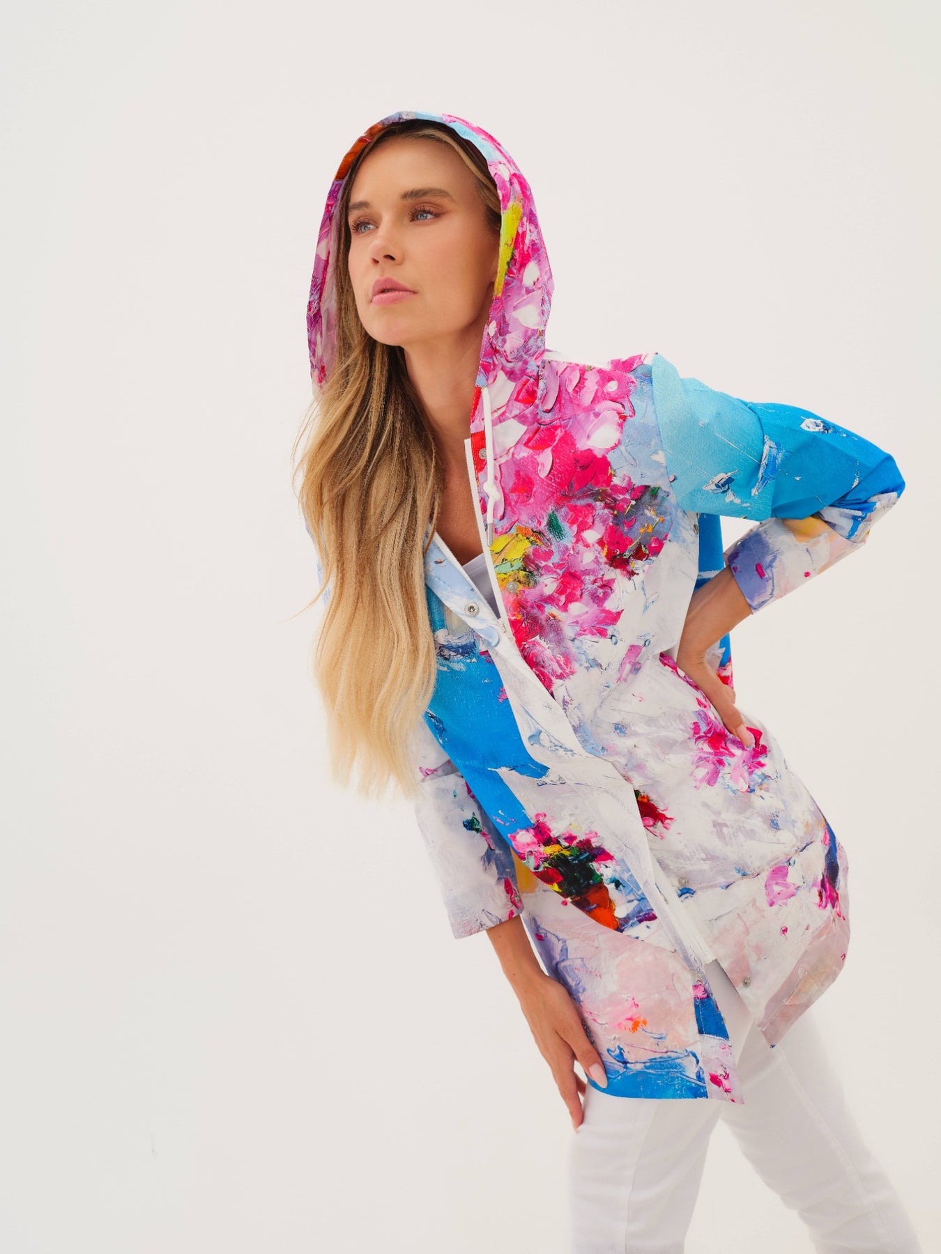 This lightweight raincoat features a bold, painterly print with vibrant splashes of color for an artistic, statement look. Designed with a hood, three-quarter sleeves, and a front zip closure, it offers practical coverage with a modern edge. The water-resistant fabric and relaxed fit make it an easy layering piece, perfect for brightening up rainy days while staying comfortable and stylish.