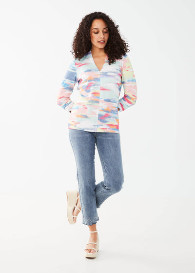 Enjoy cozy comfort and stylish sophistication in our jersey-crafted V-Neck top showcasing an on-trend local artist colorful print. Easily seamlessly blend style and effortlessness.