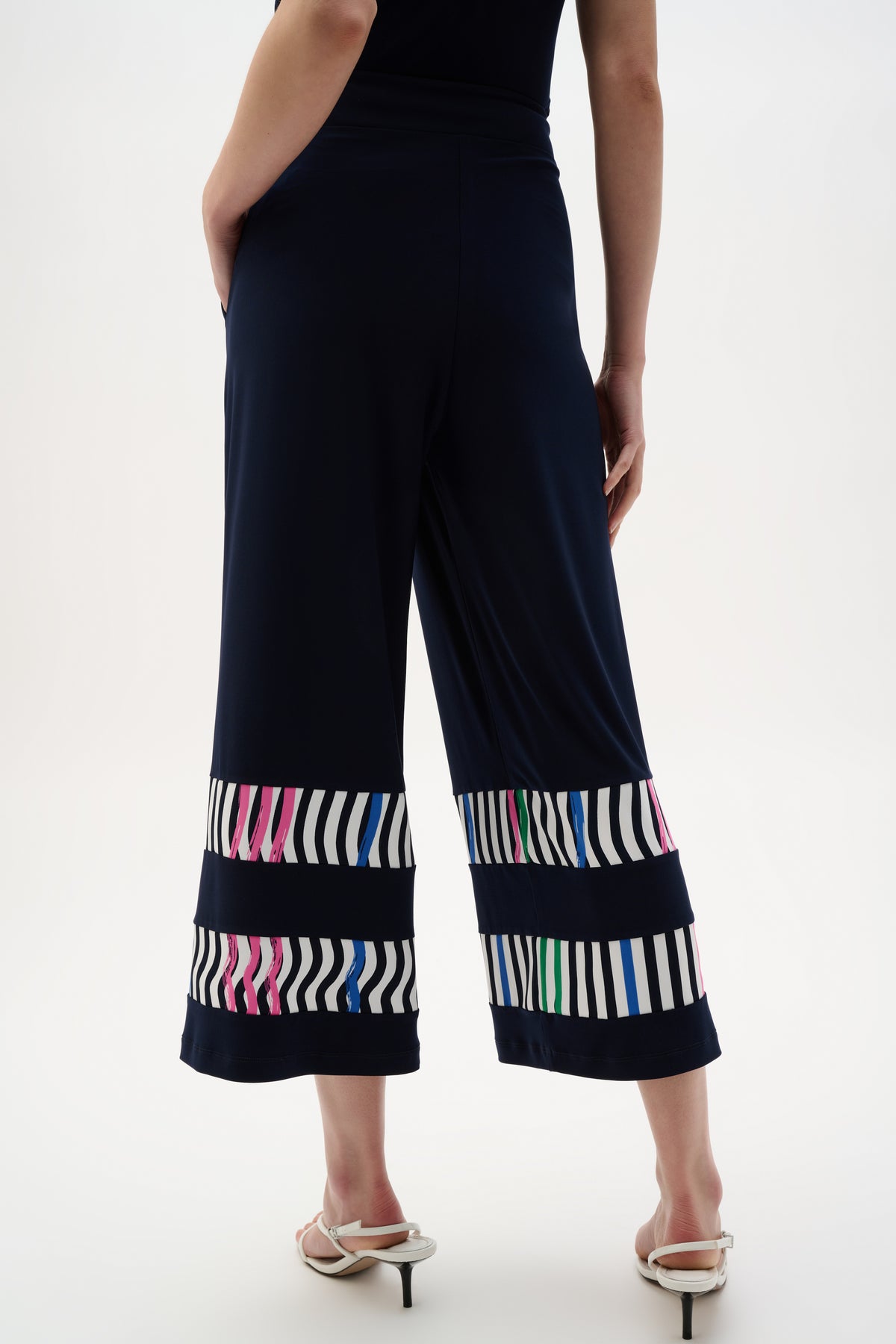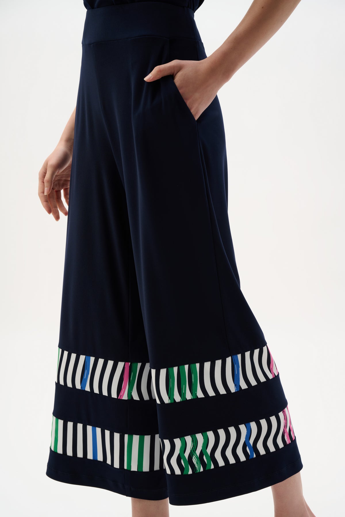 Silky knit meets woven stripe panels in these culotte pants, accented with matching stripe bands at the hem. Designed with a contour pull-on waistband and practical side pockets, they balance comfort with a polished, graphic edge.