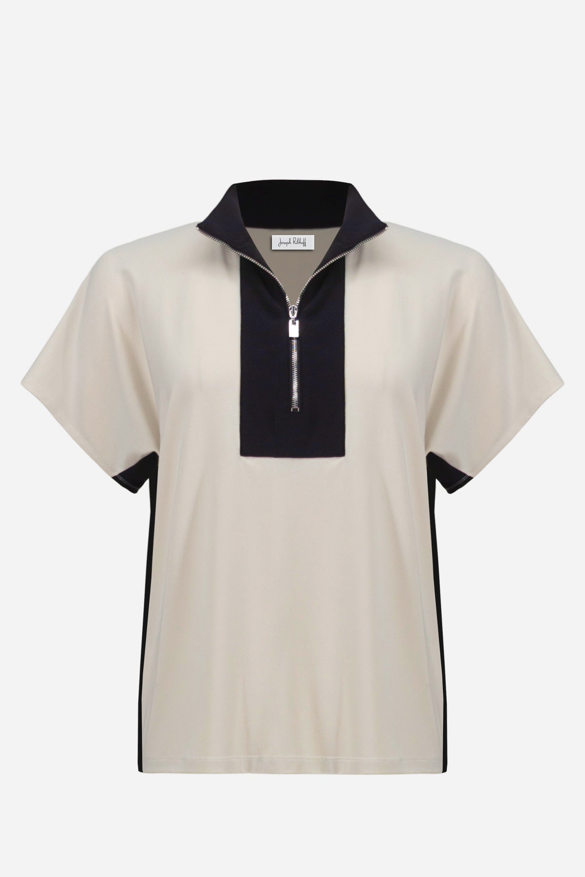 This silky knit top brings a sporty edge to clean lines, featuring a zipped stand collar and short dolman sleeves. The contrast collar and placket deliver a bold finish to the color block design. Paired with the Silky Knit Color Block Wide Leg Pull-On Pants (261612)
