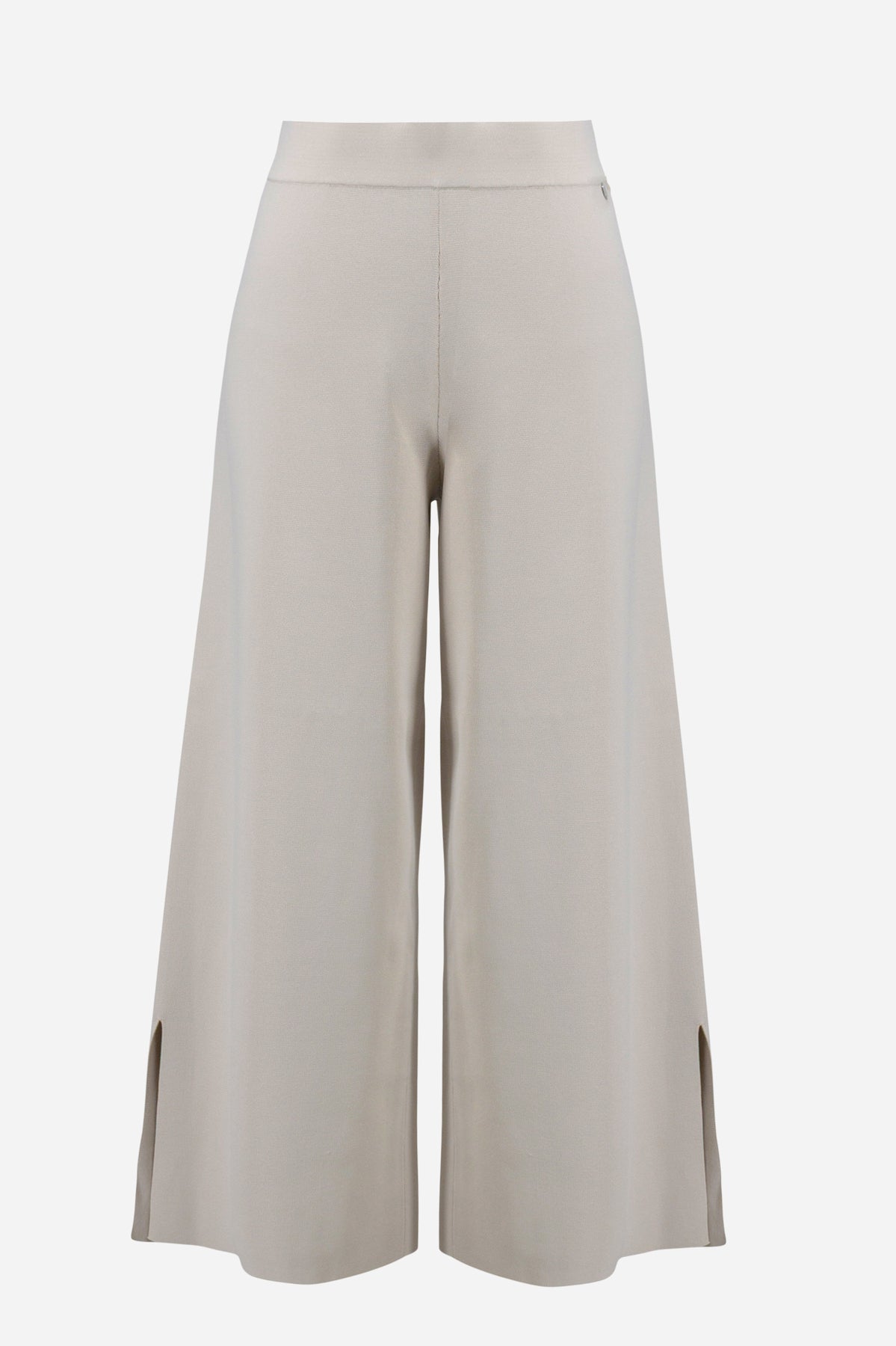 Crafted from dry viscose and nylon yarn, these full needle stitch culotte pants offer a perfect blend of comfort and style. With an inserted elastic waistband and slits at the outseam of the legs, they add a modern touch to any casual look.