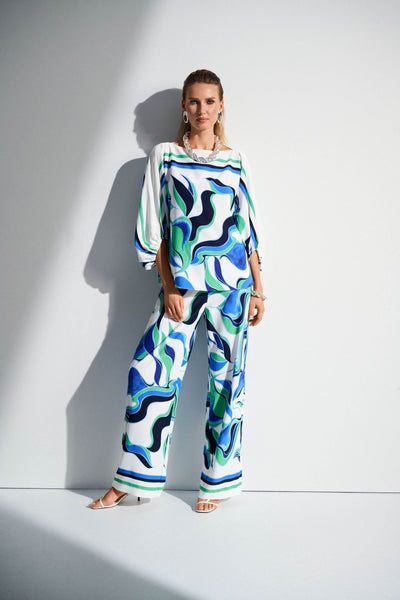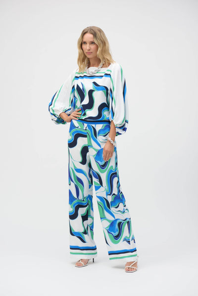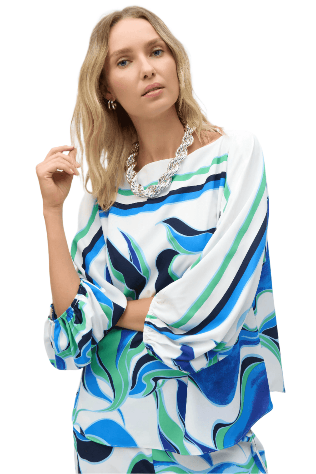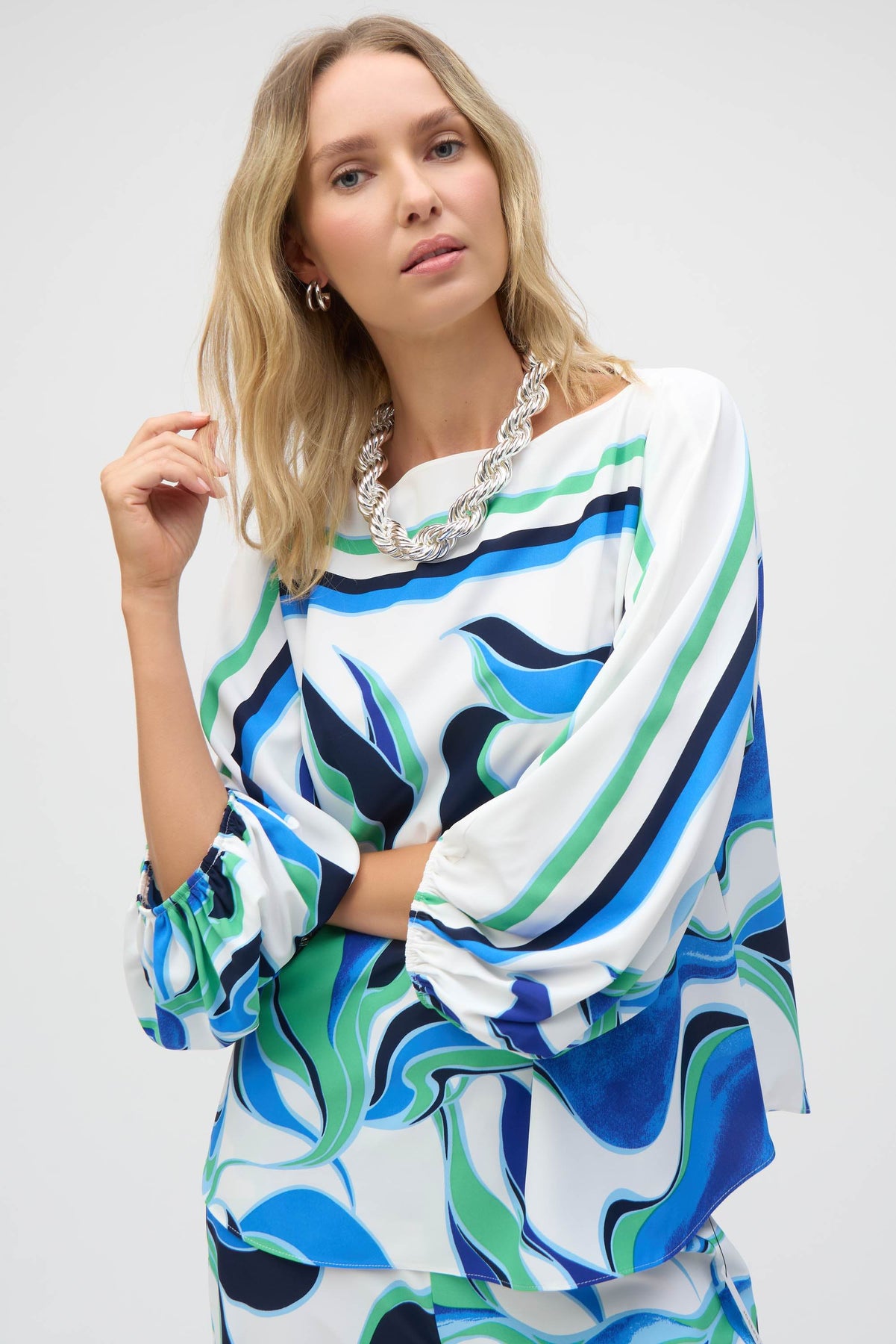 Embrace the elegance of this stunning woven top. The captivating abstract pattern and boat neck perfectly complement each other, elevating the garment with a sophisticated touch. The puffed three-quarter sleeves add drama to the boxy silhouette, while delicate stripes at the neck and shoulders provide a lovely finishing touch to this modern and striking design.