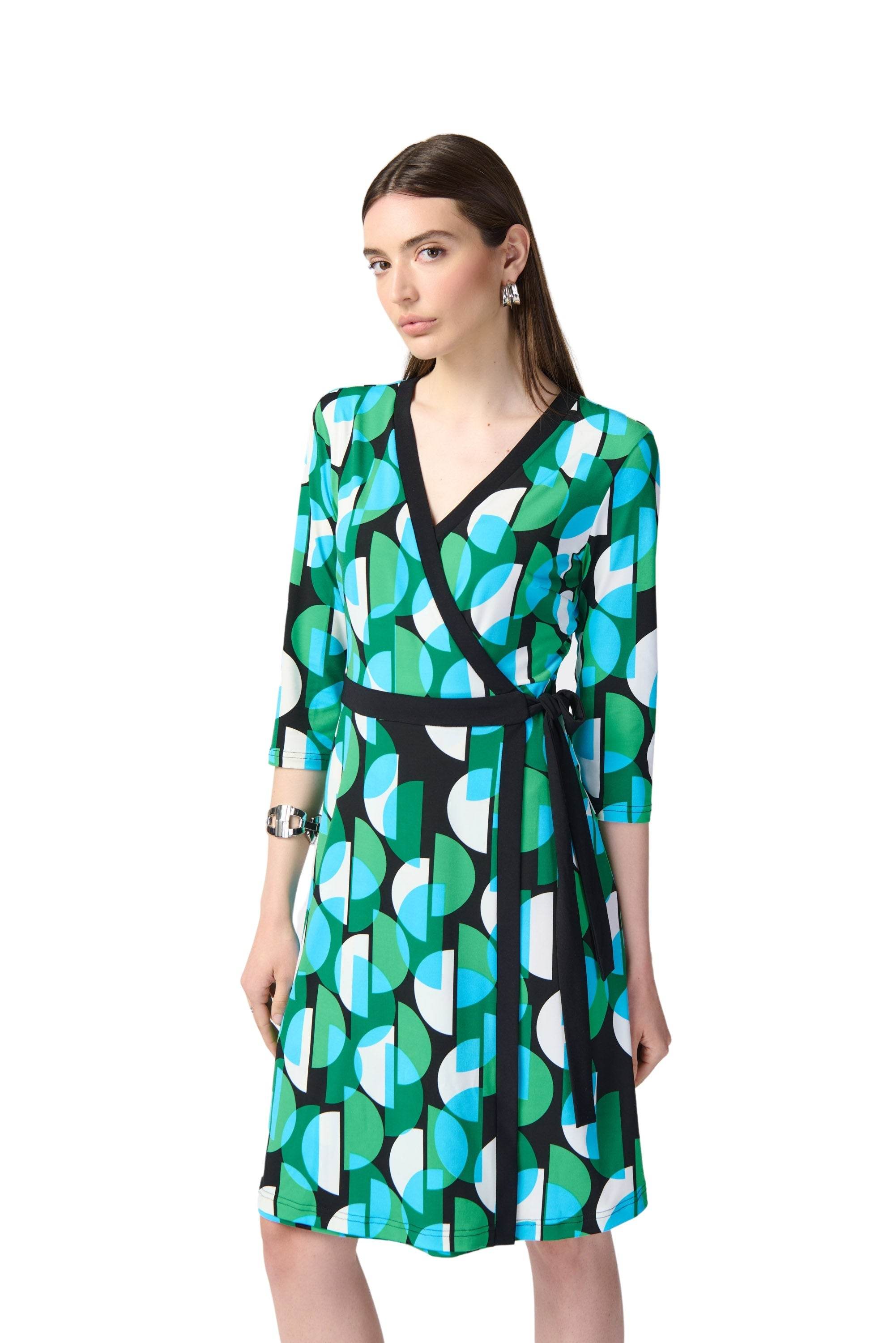 Adorned with an enchanting geometric print, this wrap dress is framed by three-quarter sleeves and a contrasting band at the neckline for added flair. A beautiful sash at the waist highlights the silhouette and contributes to the dress’s unequivocal elegance.