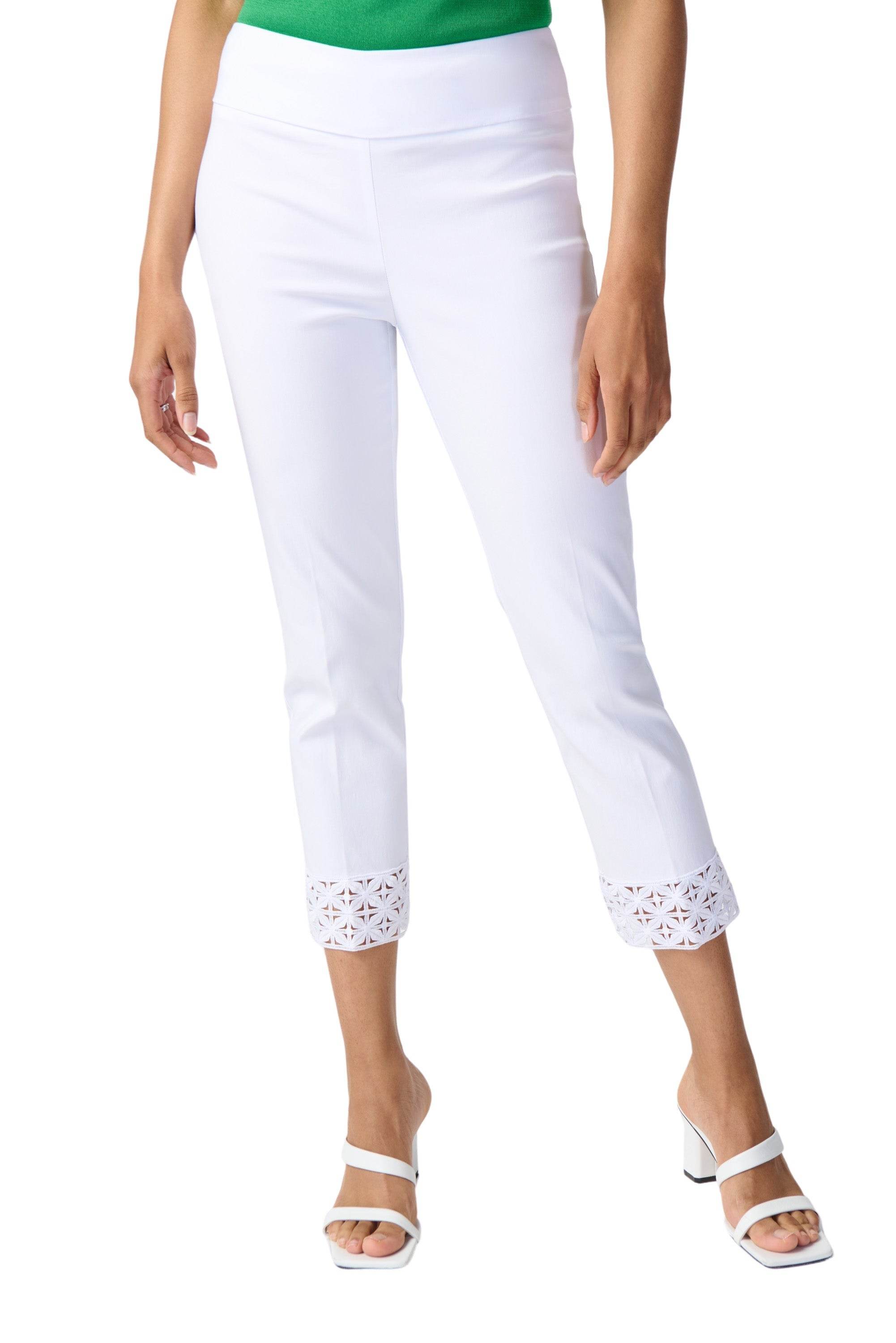 Elevate your wardrobe with these versatile pull-on pants, perfect for transitioning effortlessly from day to night. Crafted with a refined cropped silhouette in luxurious millennium fabric, these pants are designed to flatter with a structured contour waistband. Adorned with a delicate Joseph Ribkoff emblem at the back and intricate guipure detailing at the hem, these pants exude elegance and sophistication.
