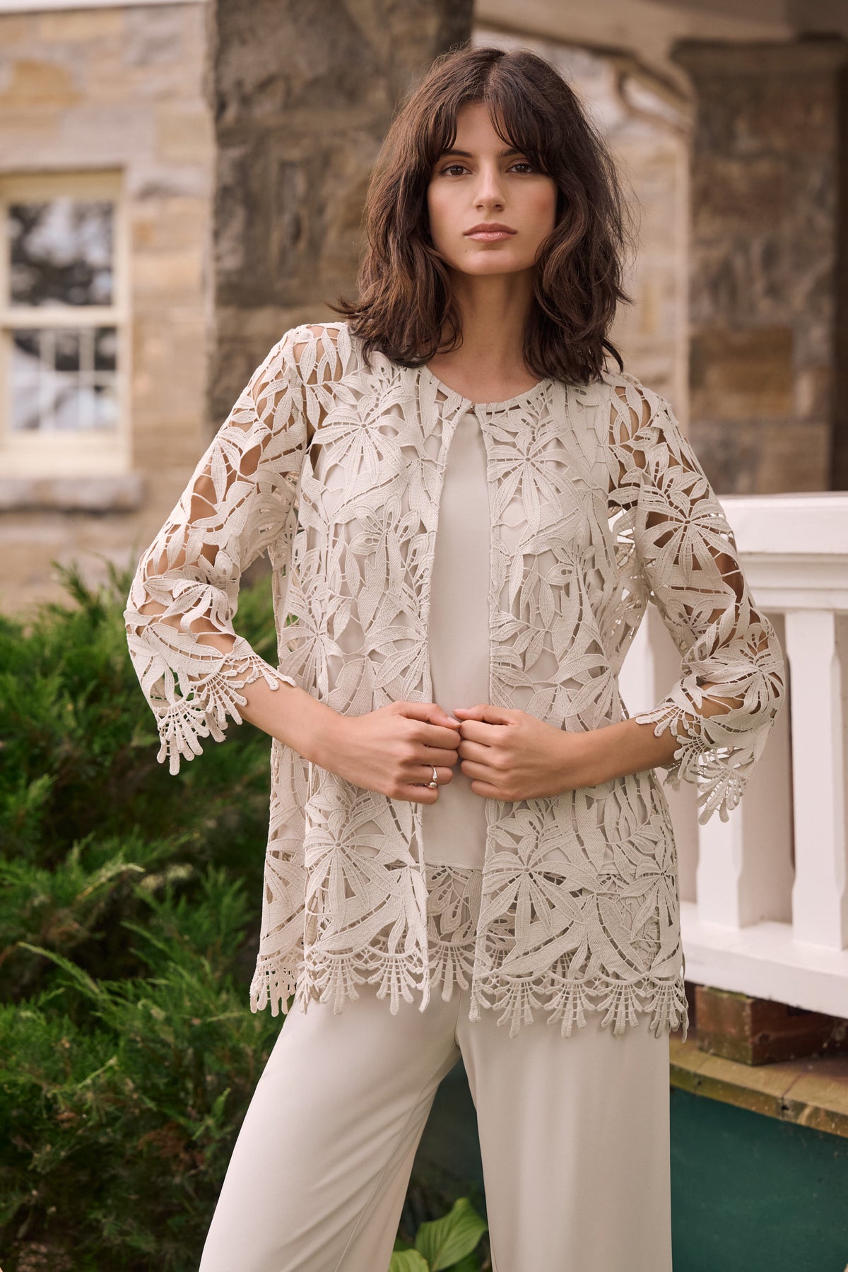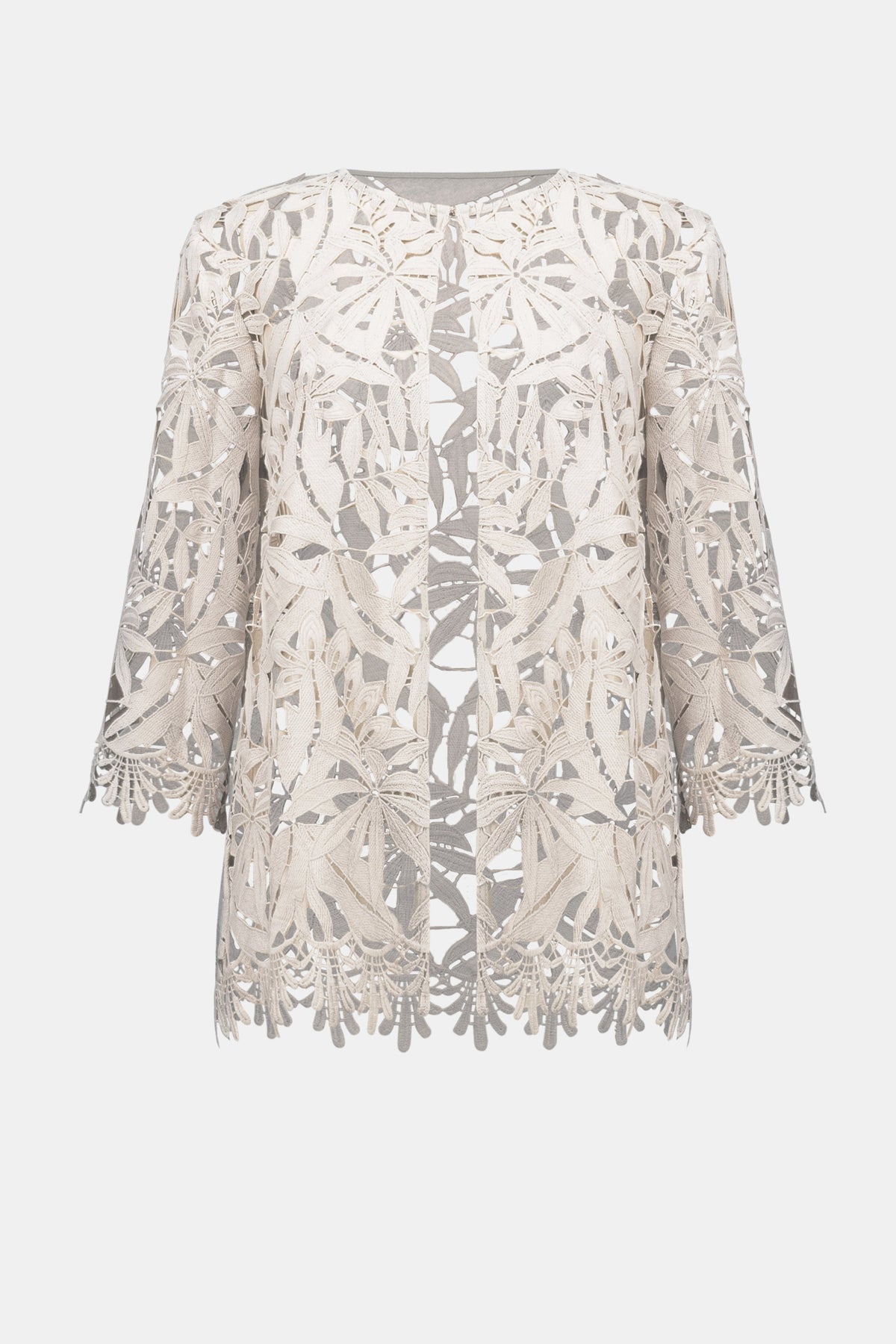 This open-front cover-up is crafted in airy guipure lace, designed with a straight silhouette and long sleeves for a balanced, elegant look. Intricate lace detailing adds a light, refined texture, offering gentle coverage while maintaining a polished and timeless feel.