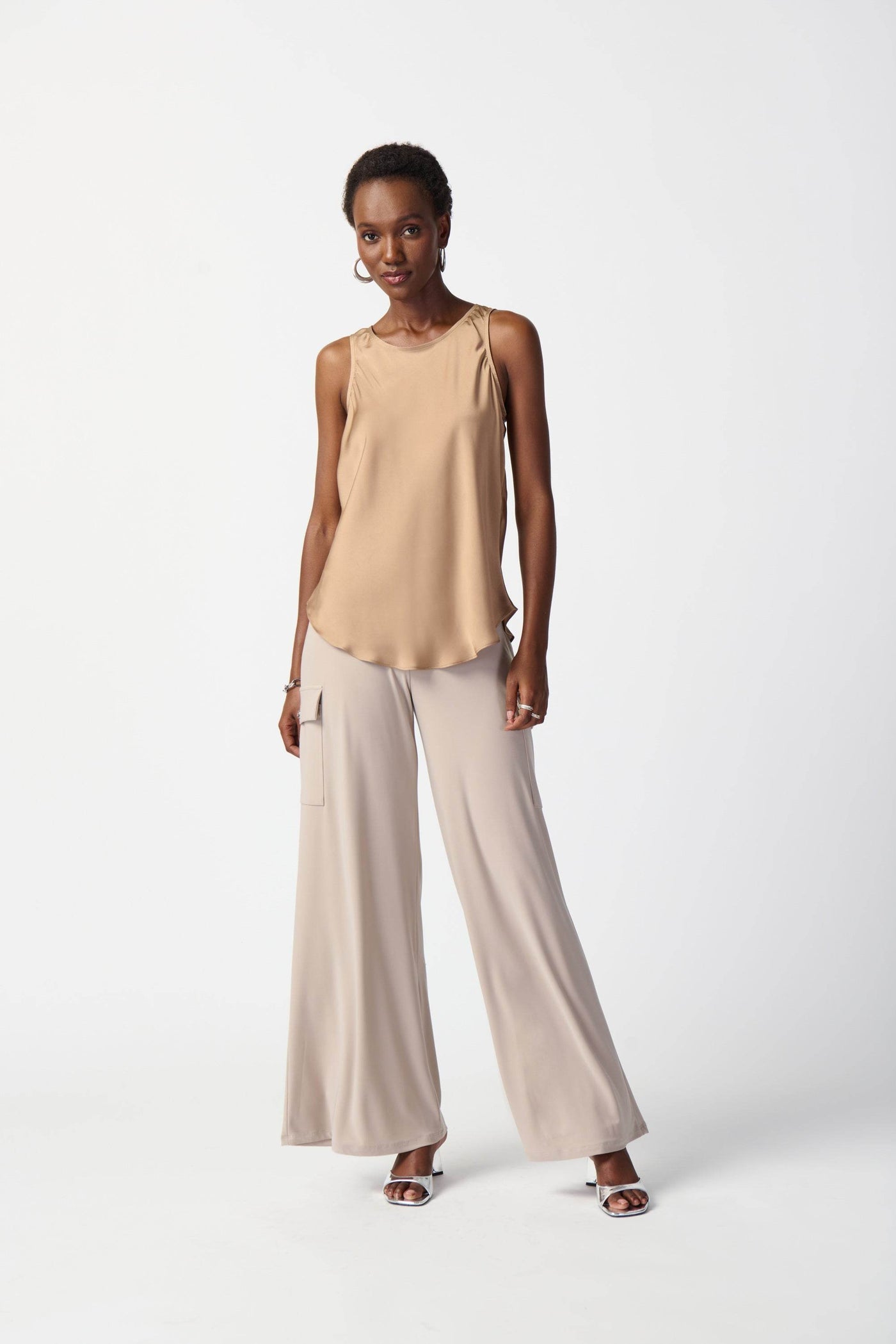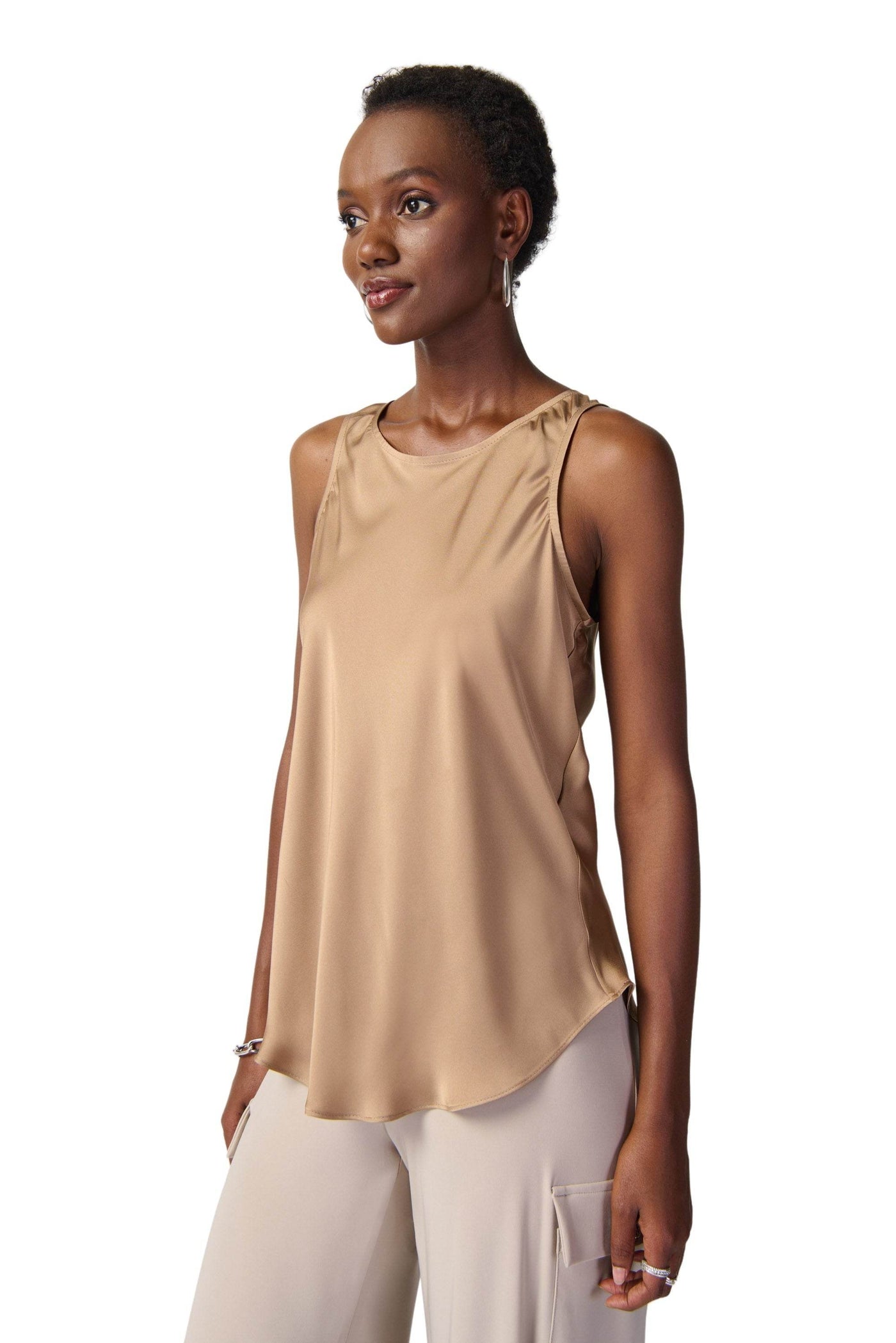 Crafted from opulent satin with a velvety texture, this sleeveless top exudes a graceful fit-and-flare silhouette. Its refined crew neckline and subtle back zipper add both flair and practicality, ensuring a versatile and sophisticated option for any event.