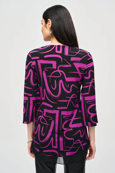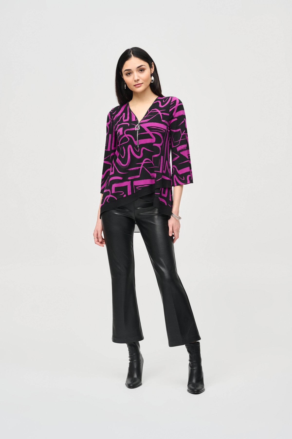 Transform your everyday look with effortless elegance. This luxurious silky knit top boasts an exquisite abstract print, a chic high-low cut, and a sophisticated keyhole neckline with a zipper accent. The addition of a chiffon insert at the hemline provides a delicate and airy touch, while the charming three-quarter bell sleeves add a unique twist to this timeless design.