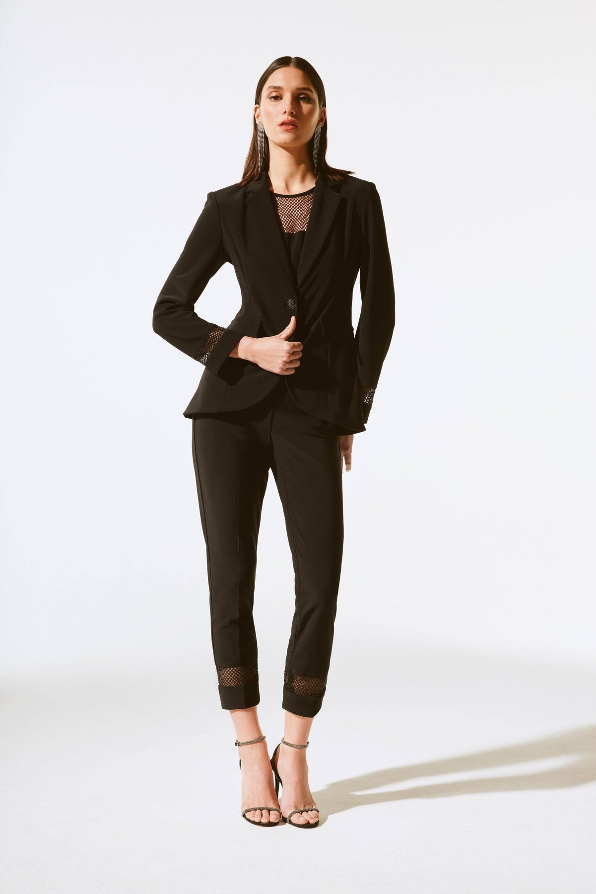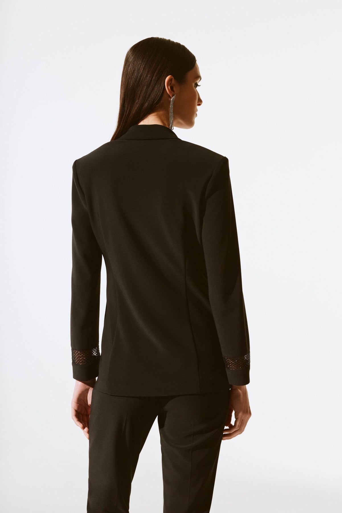 Elevate your look with our Signature silky knit blazer, complete with shimmering mesh accents at the cuffs and a sparkling rhinestone button closure. This elegant and sophisticated piece is perfect for special events or a luxurious dinner out. For a truly stunning ensemble, pair it with our Signature matching pants. Part of our exclusive Signature collection.