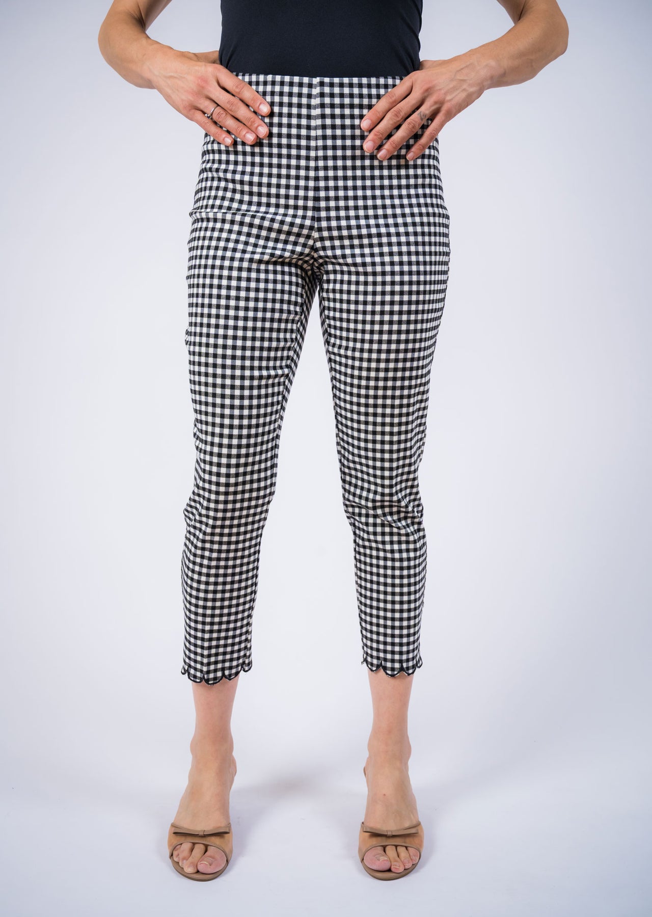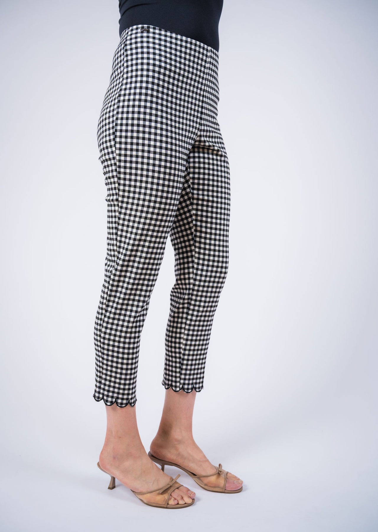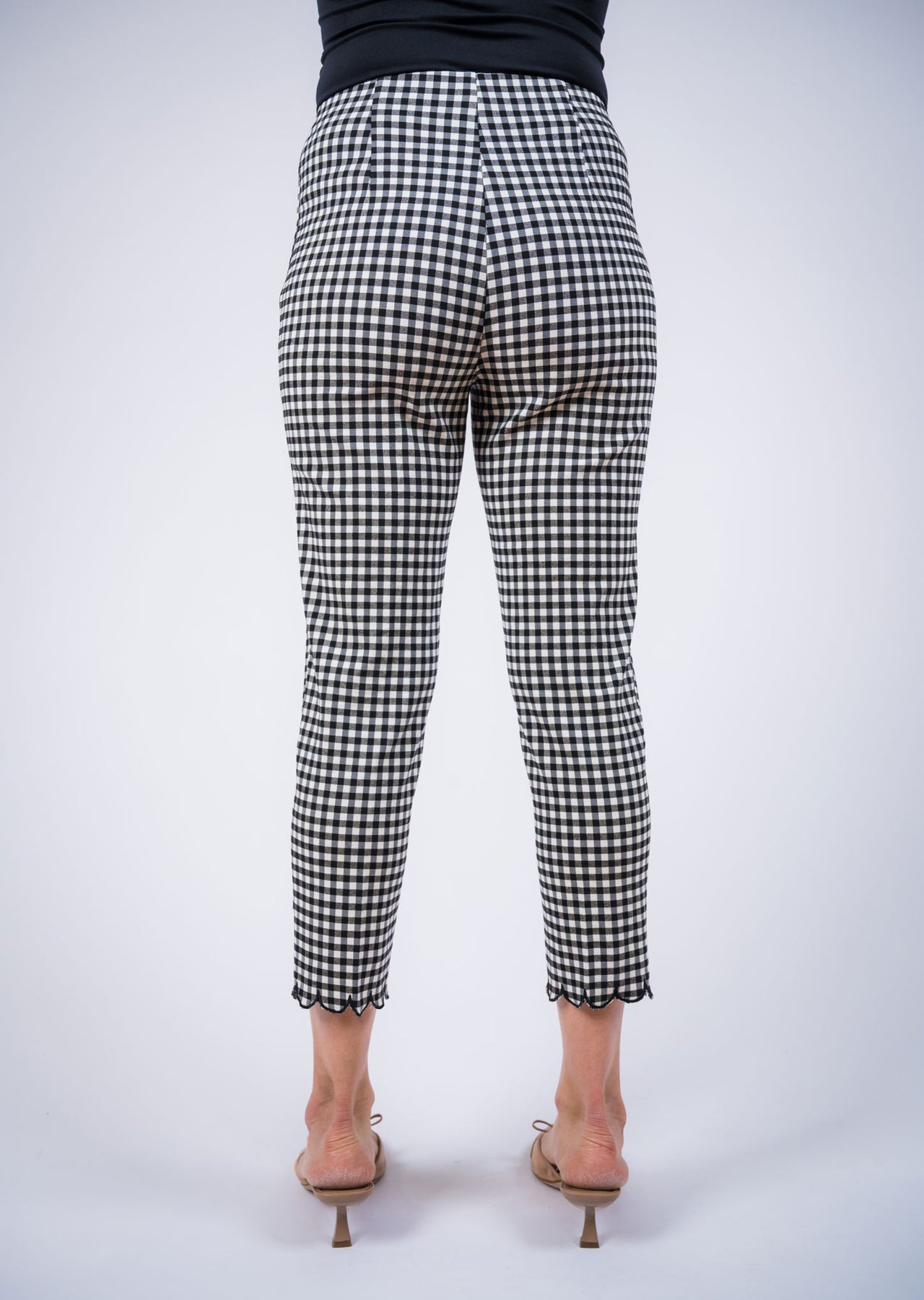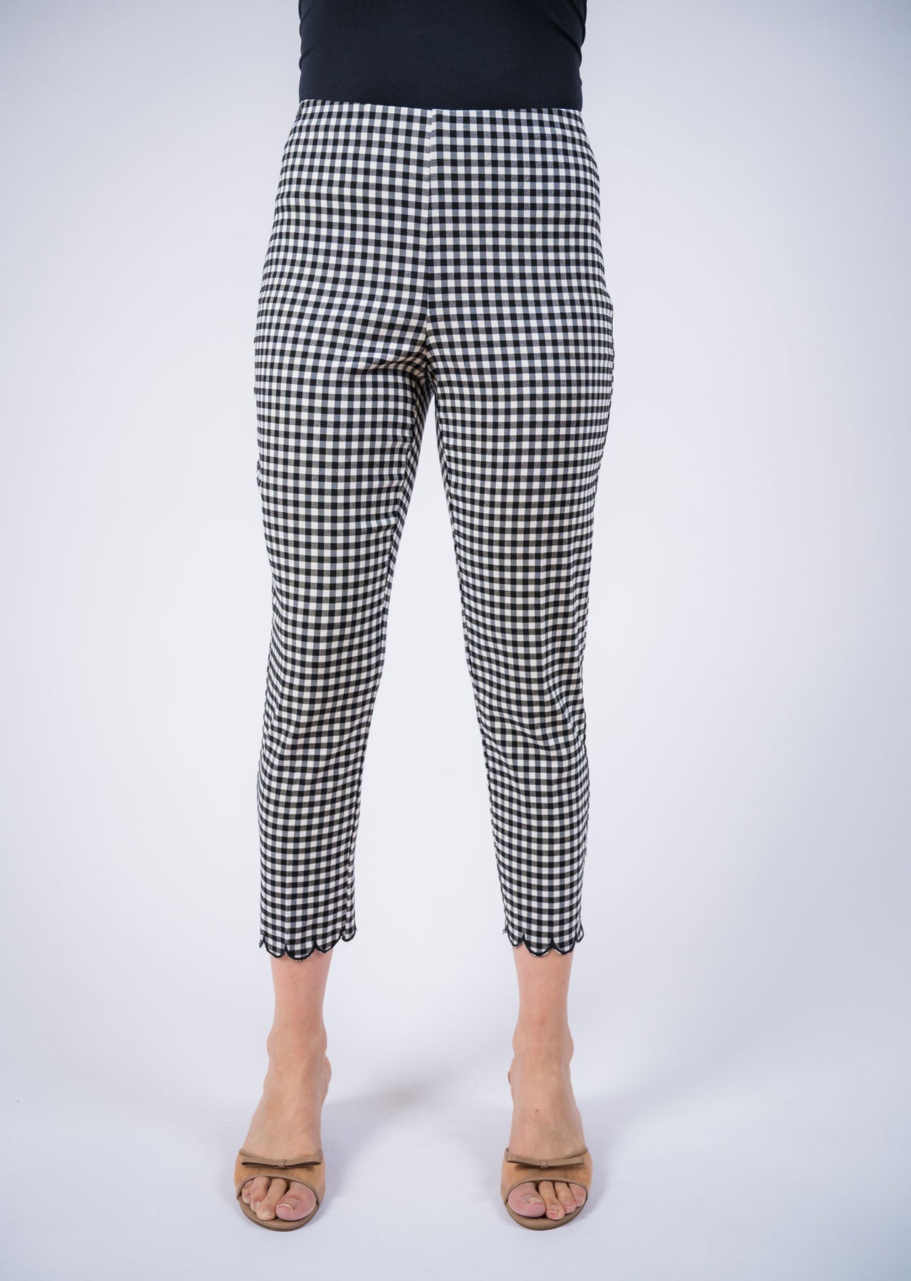 Chic and effortlessly polished, these cropped pull-on pants feature a timeless gingham pattern that adds a playful yet sophisticated touch to any outfit. Designed with a smooth pull-on waistband for a flattering, comfortable fit, the slim silhouette gently contours the body while maintaining ease of movement. The ankle-length cut is finished with a delicate scalloped hem, adding a feminine detail that elevates the
