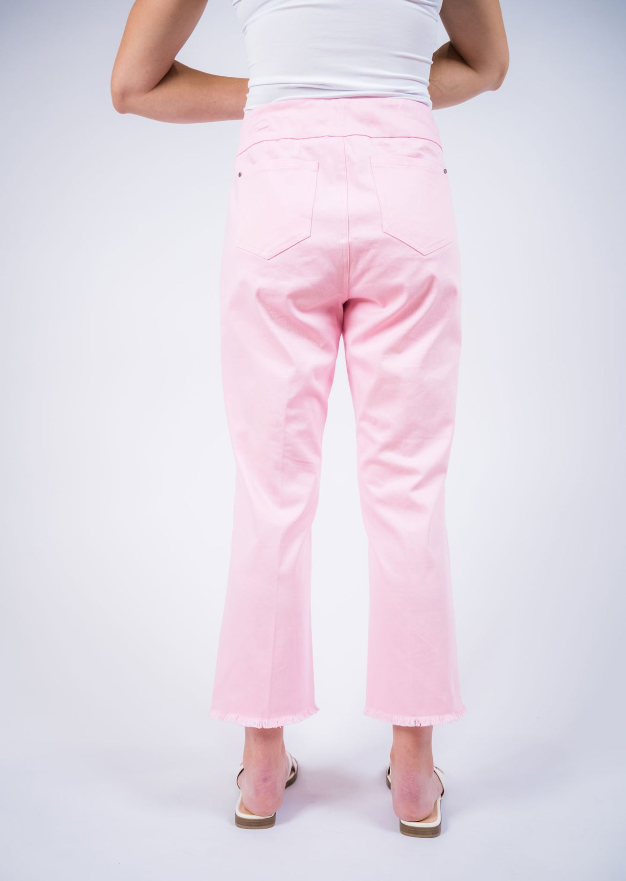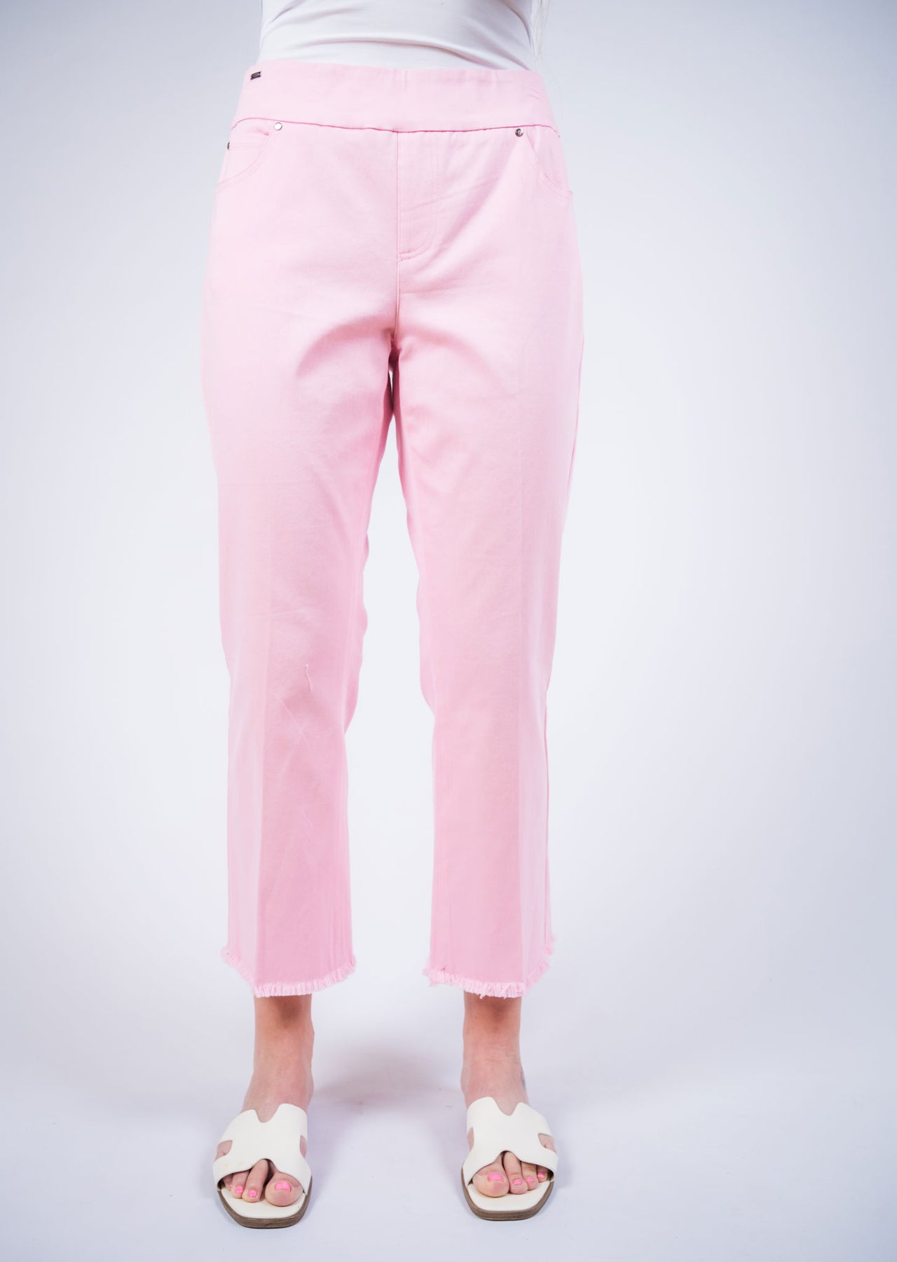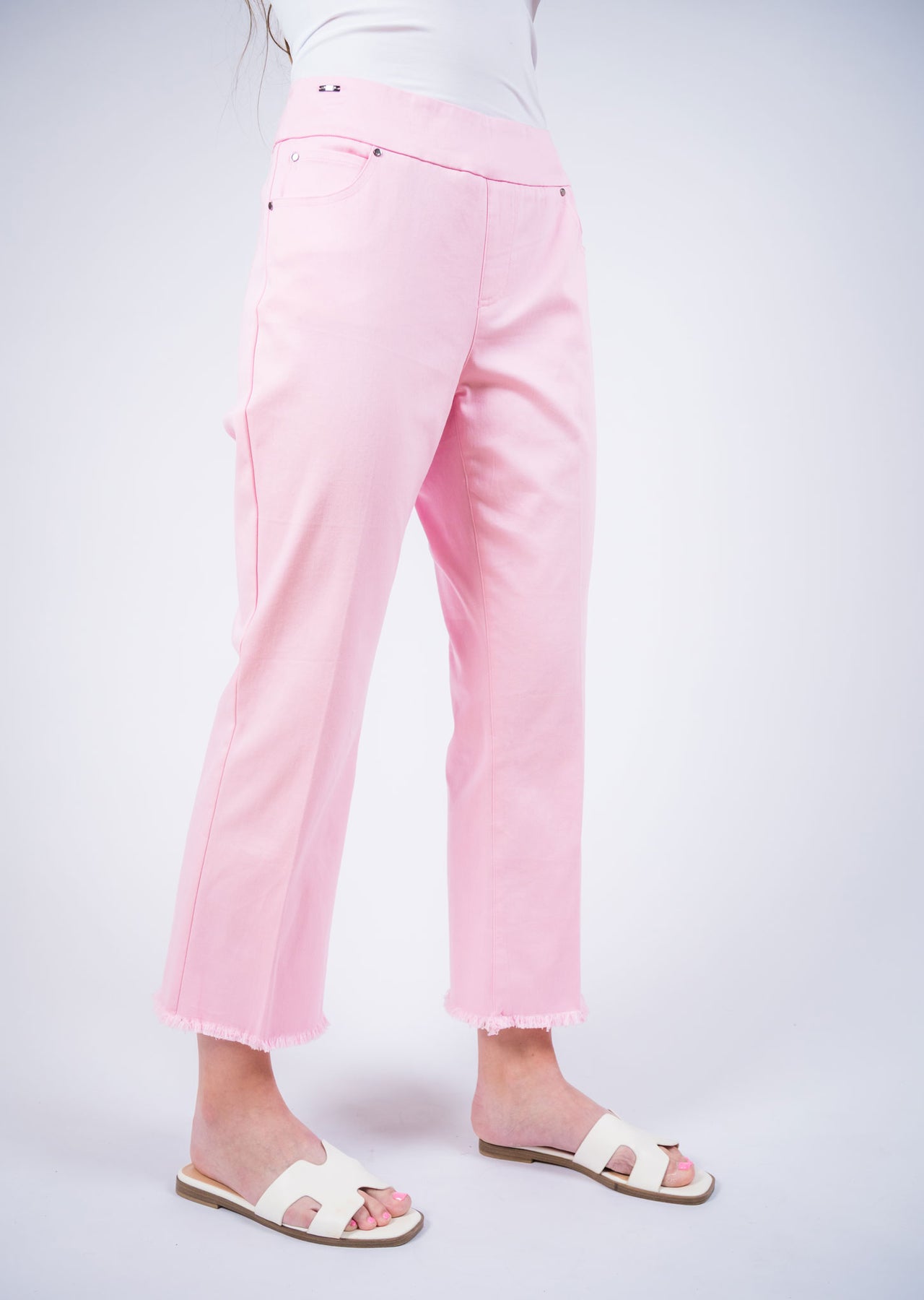 Fresh and effortlessly stylish, these cropped pull-on pants bring a modern twist to everyday comfort. Designed with a smooth elastic waistband for a flattering, easy fit, they feature a streamlined silhouette that gently skims the body. The cropped length is finished with a subtle frayed hem, adding a relaxed, contemporary edge to the clean design.