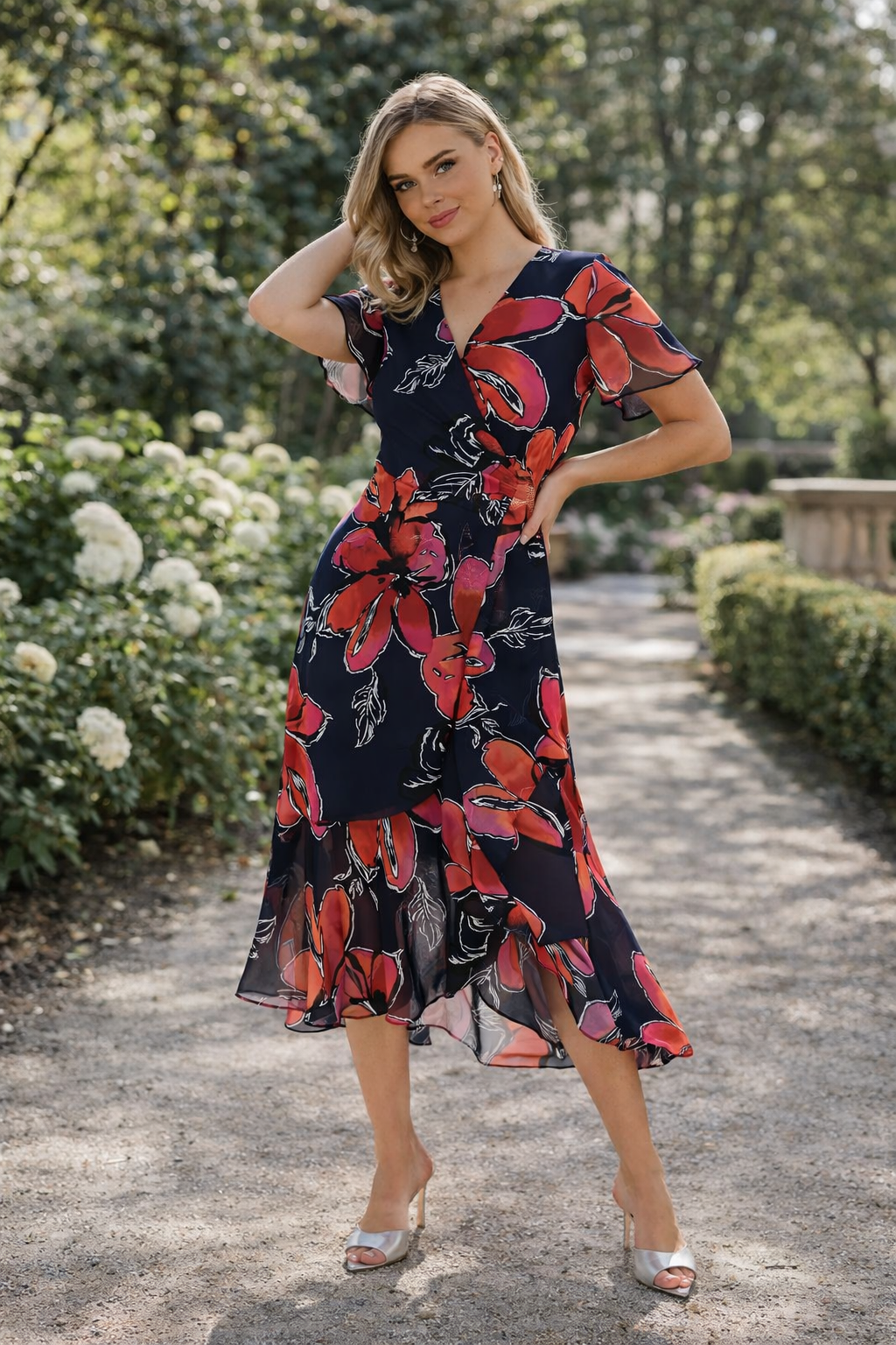 Bloom Chiffon Midi Dress in navy with vibrant red and coral florals. The soft chiffon fabric flows beautifully, while the V-neckline and flutter sleeves create a flattering, feminine silhouette. A gently shaped waist and flared hemline add elegance and movement. Ideal for special occasions when you want to look polished and feel confident.