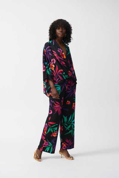 Elevate your style with these impeccably tailored, luxurious silky knit pants. Featuring a vibrant tropical print, the wide-leg silhouette exudes confidence and grace with each step. Pintucks at the front and back, along with a topstitched front, add a touch of sophistication and polish. The shirred waistband adds an elegant detail to this exquisite piece.