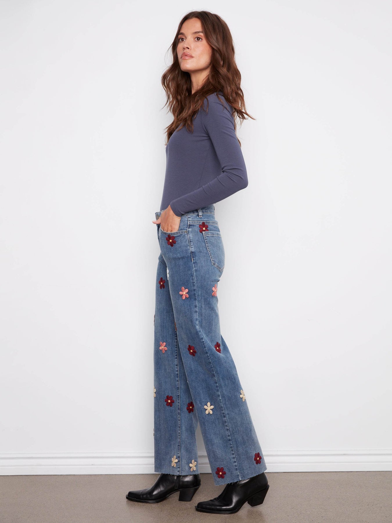Wide Leg Jeans With Flower Patches - Dream Pants