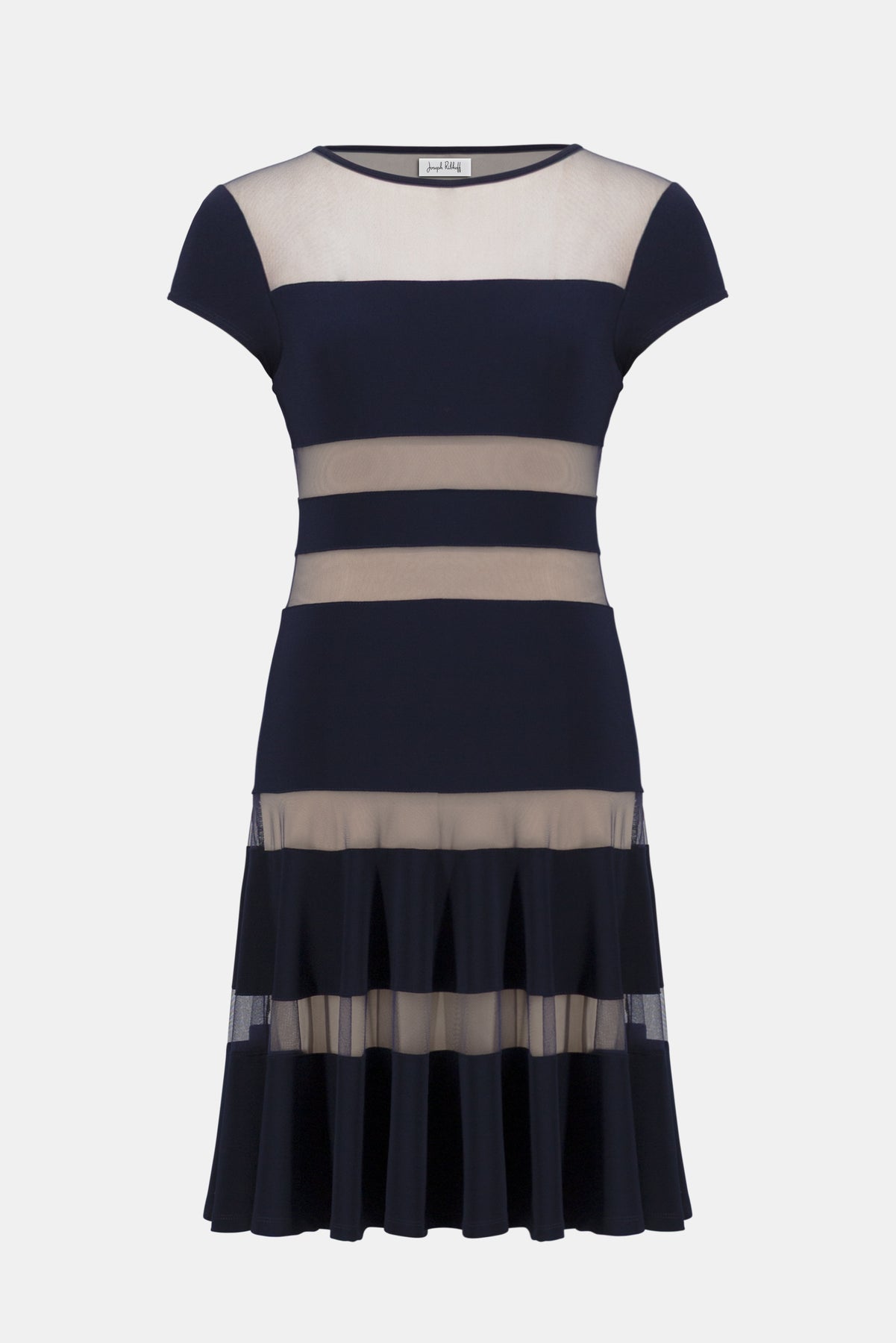 Silky knit dress with mesh inserts and a flattering fit-and-flare silhouette. Features a boat neckline and cap sleeves for effortless elegance.