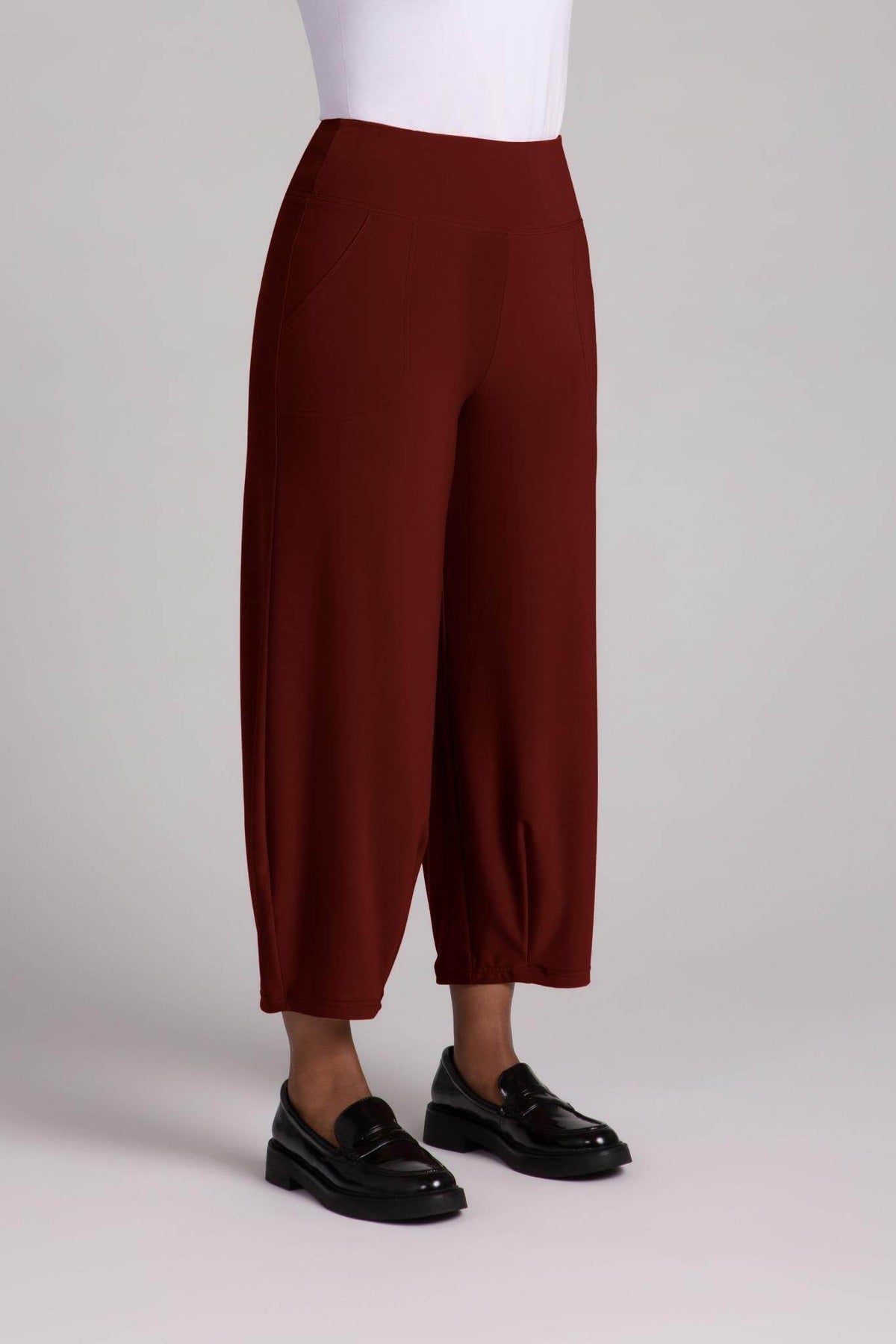 This ankle-length pants are going to become your go-to for when you are looking for something comfortable and stylish! It features a wide lantern-shaped leg and stitched-down side pockets. These pants go perfectly with tops that accentuate its high yoke waistband.