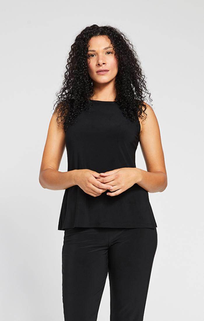 The Sympli Nu Ideal Sleeveless Tank, style 21177, is a multipurpose essential top for all seasons. Features a high neckline and subtle side slits.