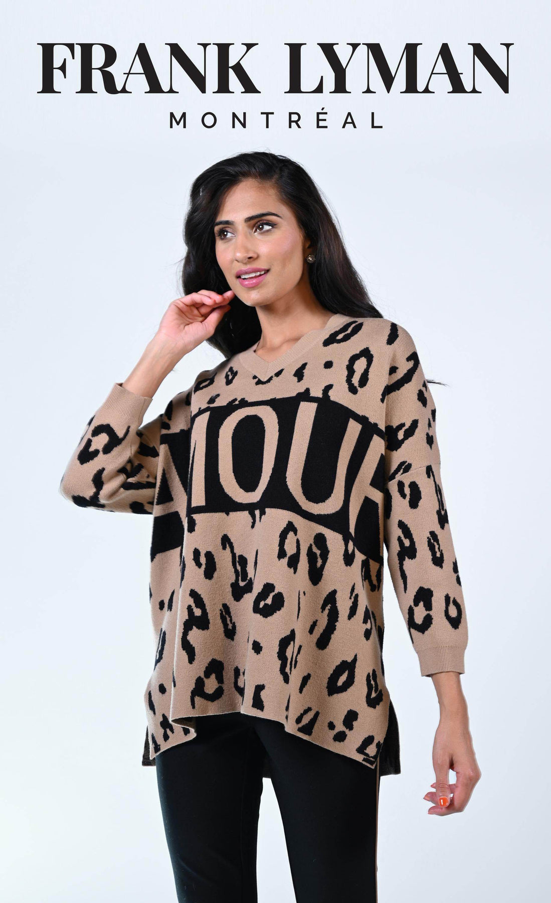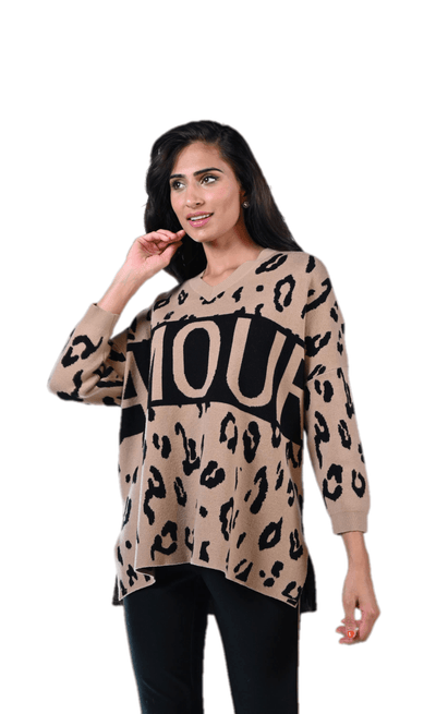 Ce pull en tricot confortable présente un magnifique imprimé animal et un motif AMOUR. Il est fabriqué avec une coupe surdimensionnée et une manche 4/5 pour une sensation confortable et douillette.
