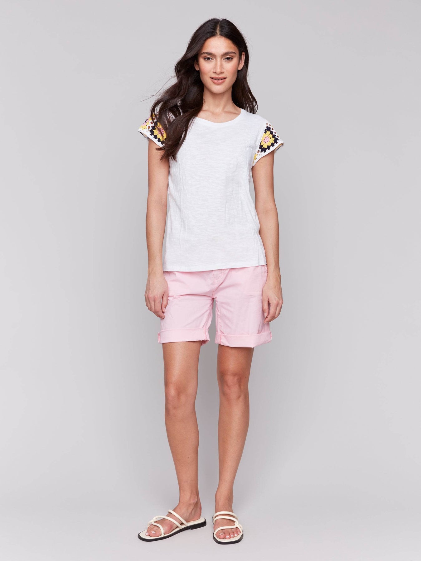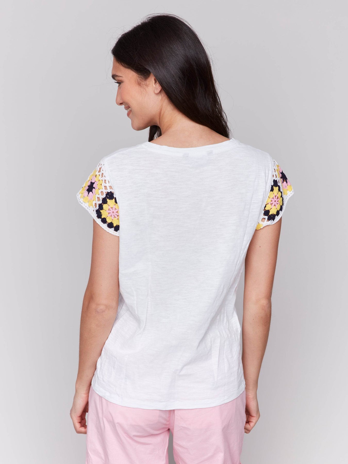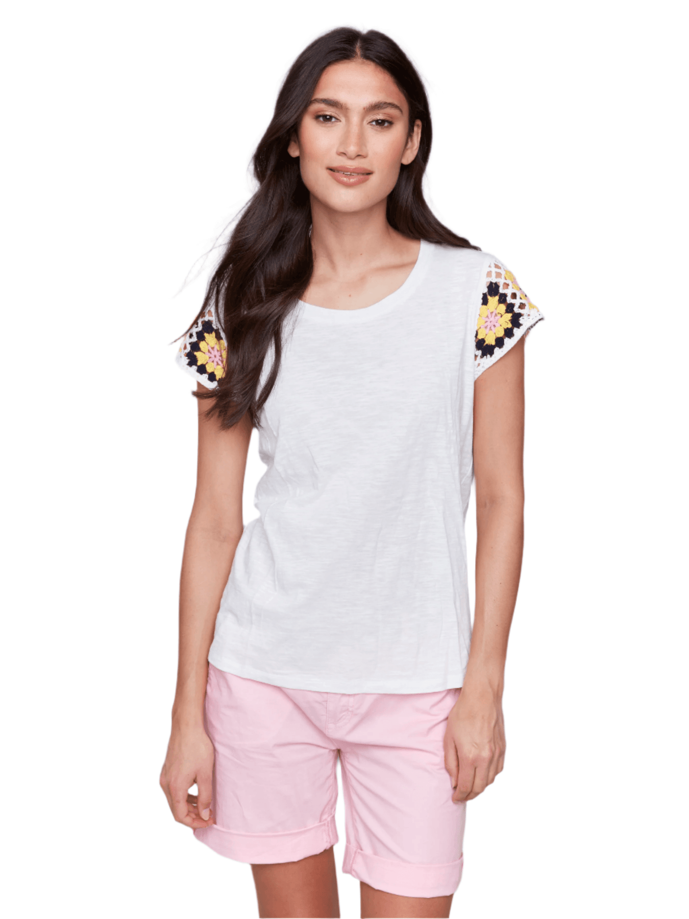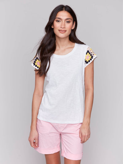 Offrez-vous confort et style avec notre t-shirt à manches courtes en crochet, confectionné dans un luxueux jersey de coton flammé. Vous apprécierez la douceur et la légèreté du tissu ainsi que les détails délicats des manches en crochet. Parfait pour toutes les occasions décontractées, ce t-shirt rehaussera votre garde-robe d'une touche d'élégance et de confort inégalée. Ne vous contentez pas de t-shirts ordinaires, offrez-vous le summum du style et du confort.