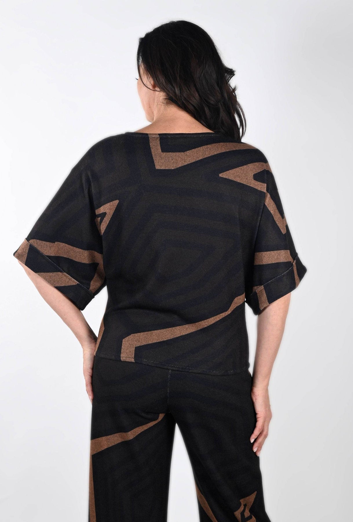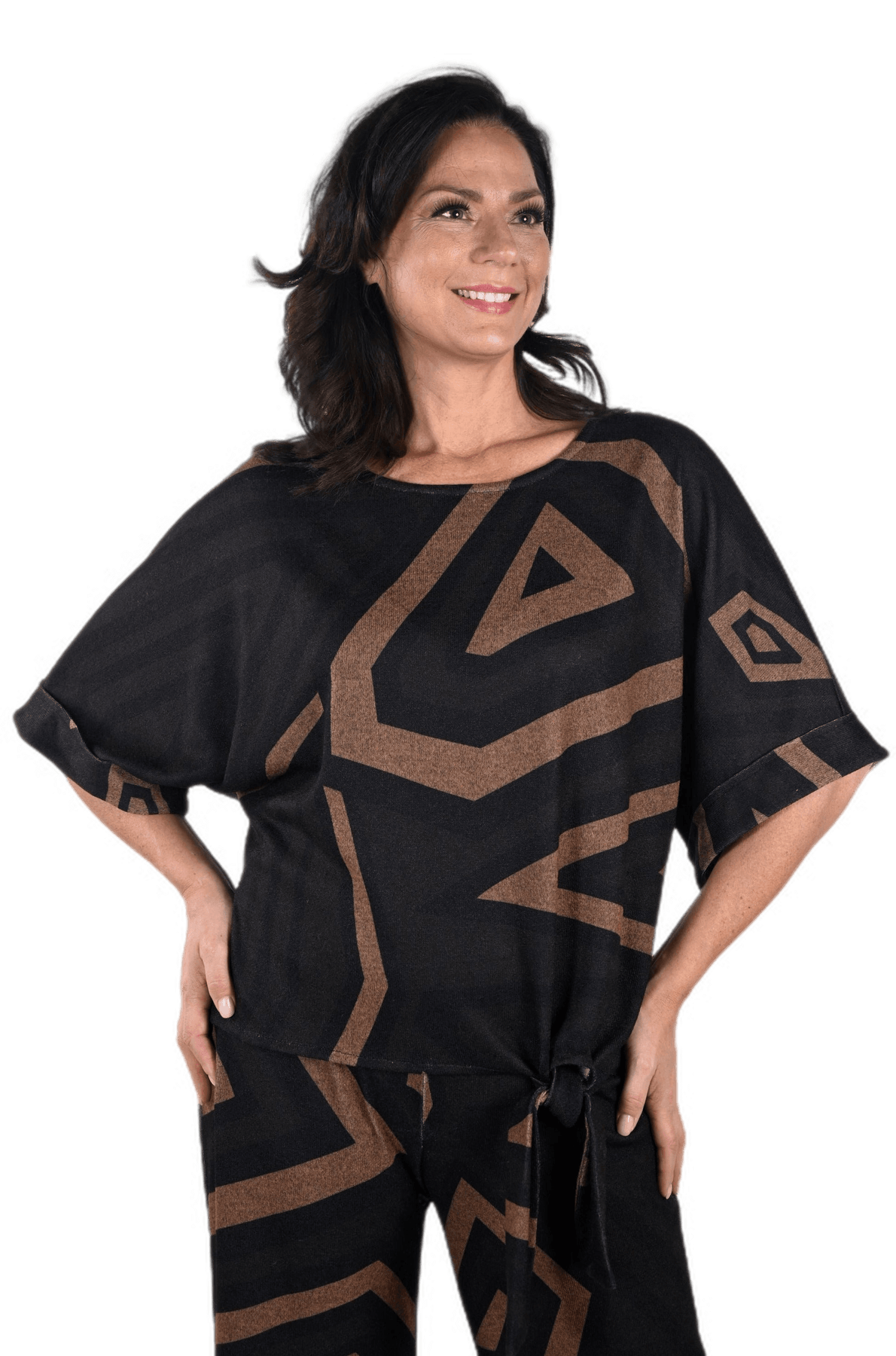 Ce haut noir et marron arbore un imprimé abstrait captivant, apportant une touche artistique à votre tenue. Ses manches fluides arrivant aux coudes offrent une allure élégante et légère, idéale pour les occasions décontractées comme habillées. 100 % polyester