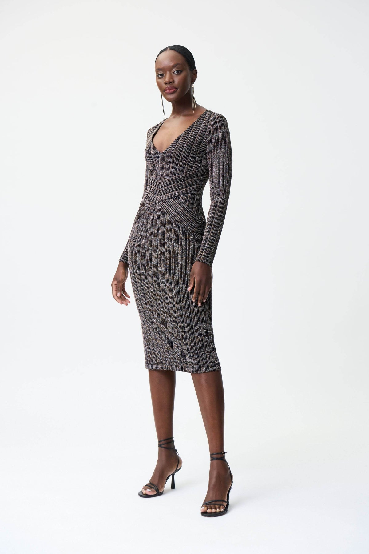 La robe à col en V Joseph Ribkoff style 224239 va devenir votre tenue incontournable pour les événements et soirées ! Il présente une encolure en V, des manches longues et un tissu confortable qui met en valeur tous les bons endroits. Son motif linéaire lui donne un look moderne sans lui enlever sa silhouette classique !