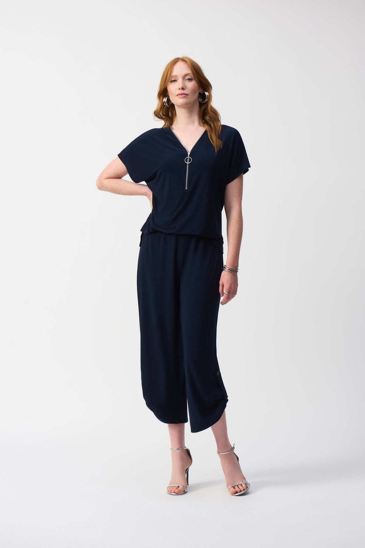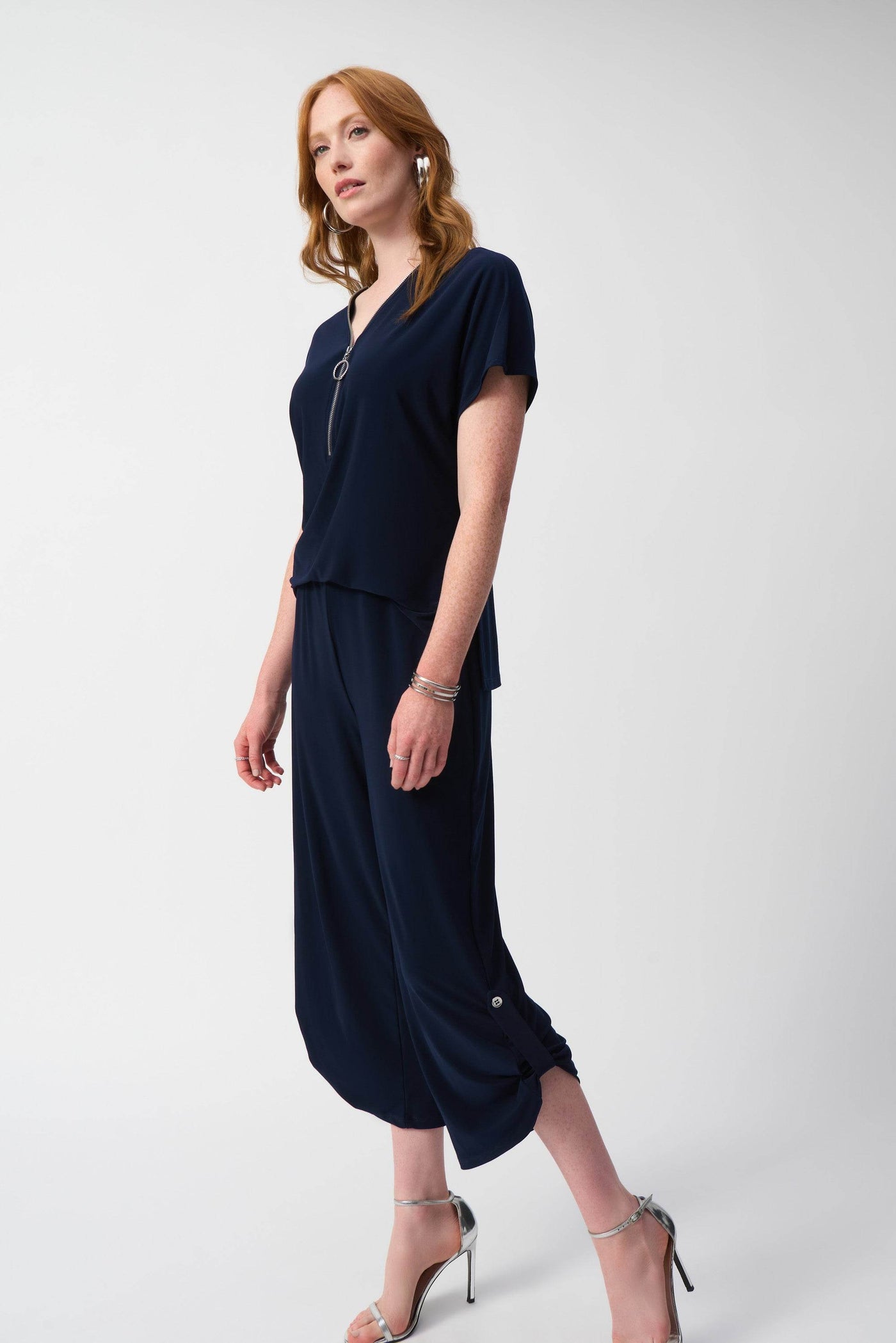 Découvrez le design raffiné de cette combinaison-pantalon en maille soyeuse. Son style moderne se caractérise par une élégante patte de boutonnage à l'ourlet et une fermeture éclair audacieuse qui souligne l'encolure. Les manches courtes dolman apportent une touche sophistiquée à cette pièce intemporelle.