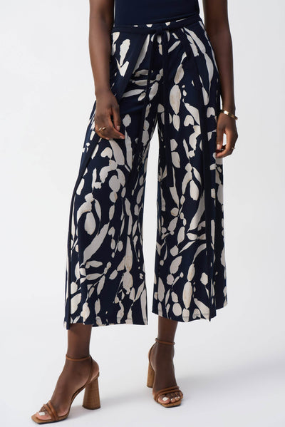Découvrez l'alliance parfaite du confort et de l'élégance avec ce pantalon large en maille soyeuse. Doté d'une ceinture repliée, d'un empiècement croisé stylé avec lien et d'un imprimé abstrait captivant, ce pantalon ne manquera pas de faire sensation. Des fentes latérales flatteuses et des pinces dos qui mettent en valeur la silhouette ajoutent à son charme irrésistible.