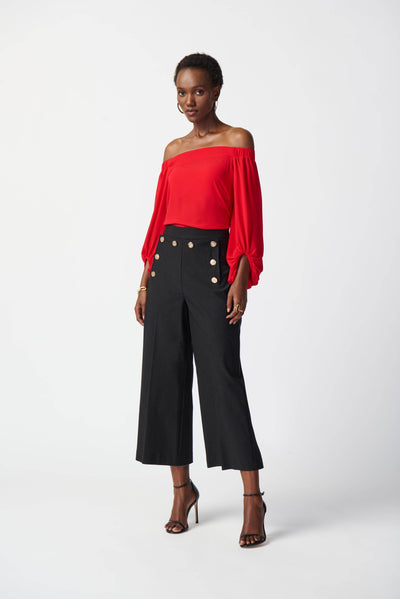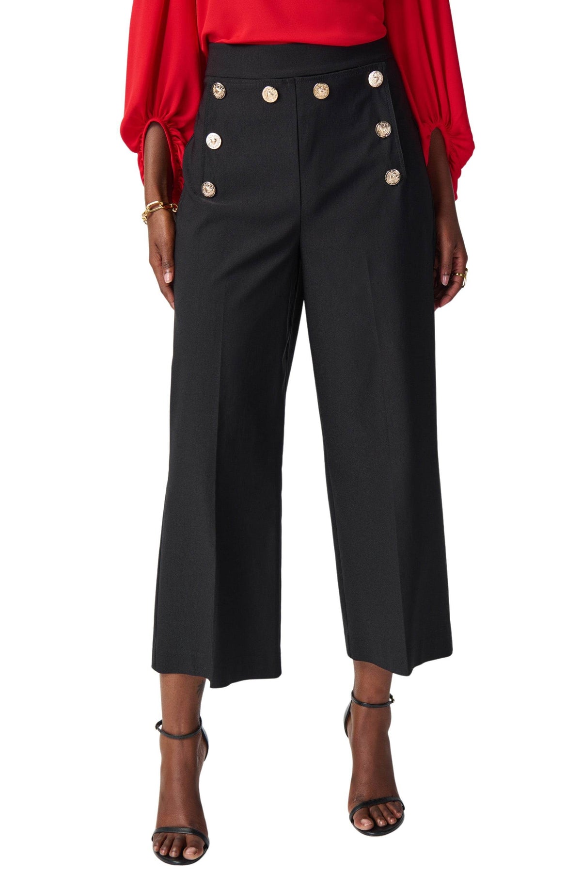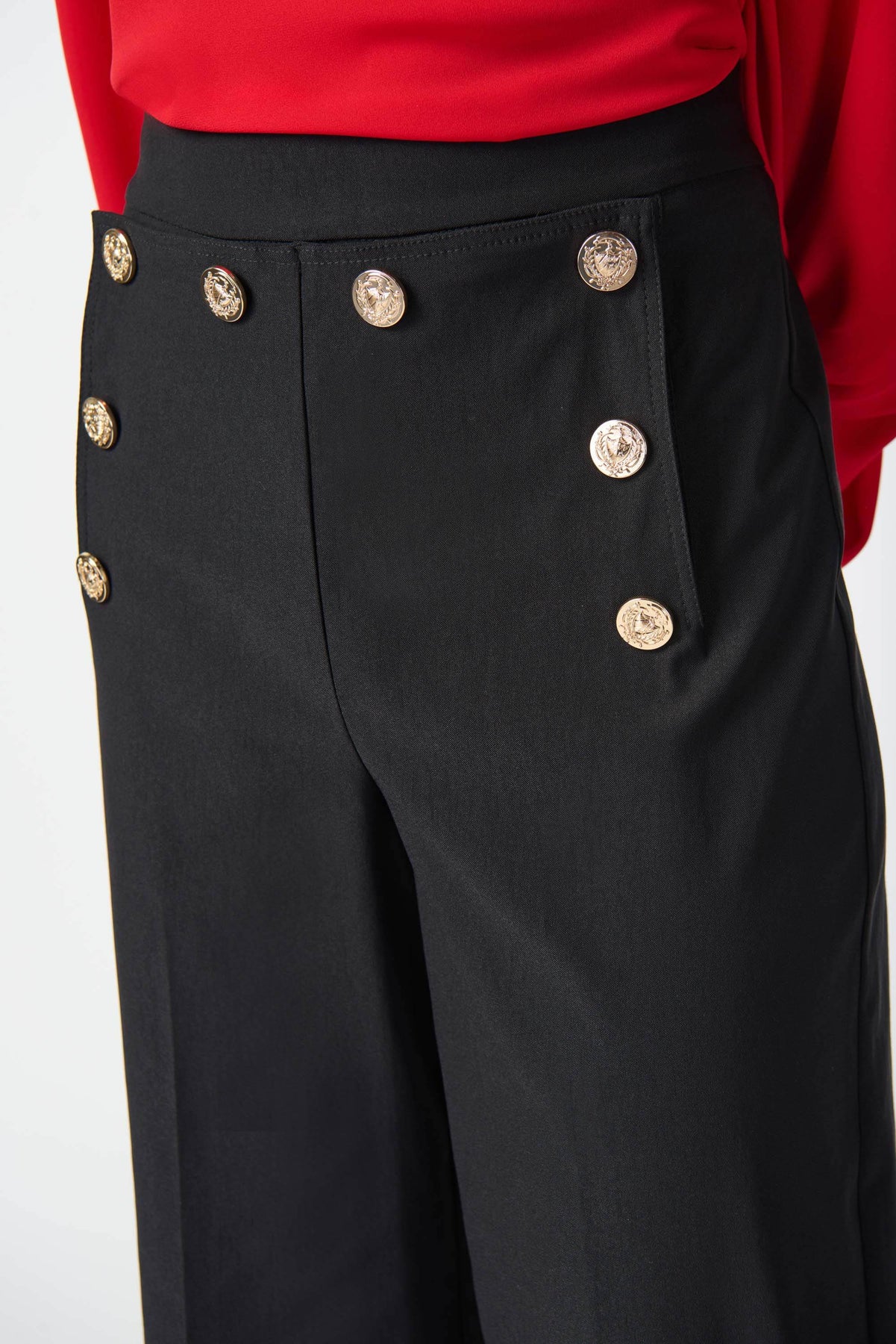 Explorez un univers de style avec notre pantalon culotte chic, doté d'une fausse ouverture sur le devant et de boutons dorés d'inspiration nautique qui respirent l'élégance. La coupe culotte apporte une touche de modernité à ce modèle intemporel, tandis que le tissu confortable millennium vous assure un confort optimal tout au long de la journée.