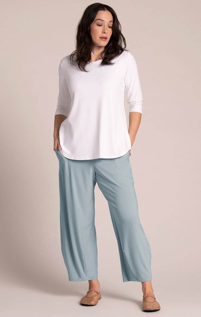 I like these pants because they fall nicely and look sleek. I have bought this style several times because I’m short (5’3”), and the style hits at my ankles. The stone blue is a beautiful color, and I’m so glad I added this pant and the relaxed T (3/4 sleeves) to my wardrobe.