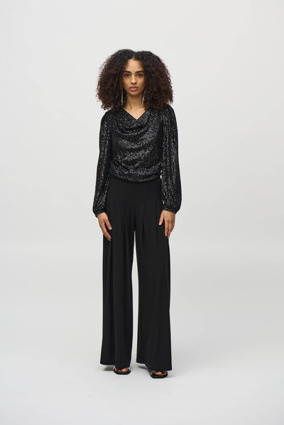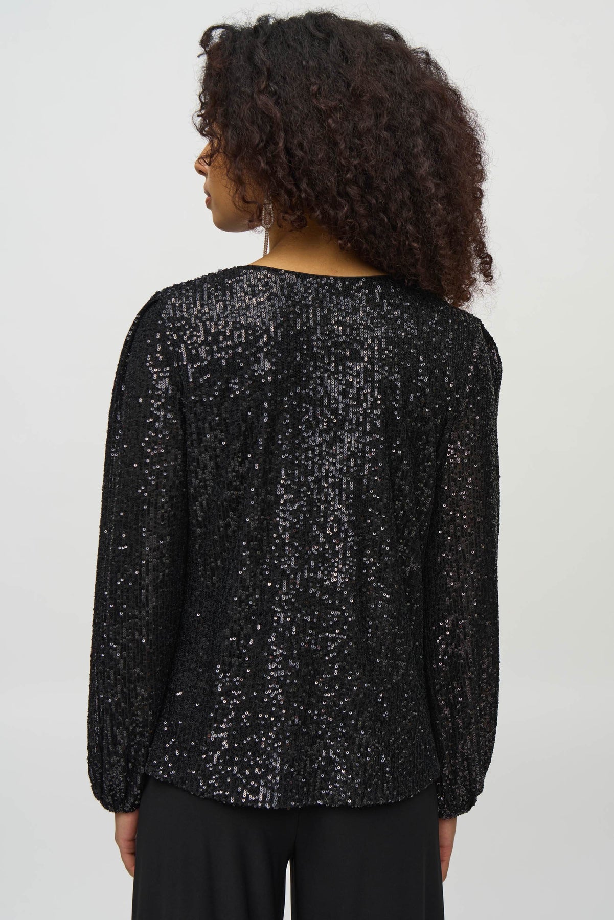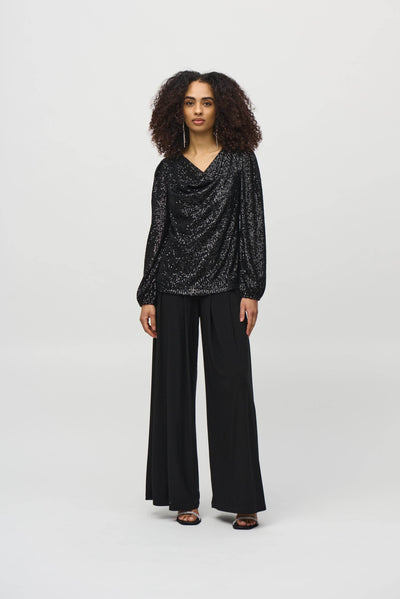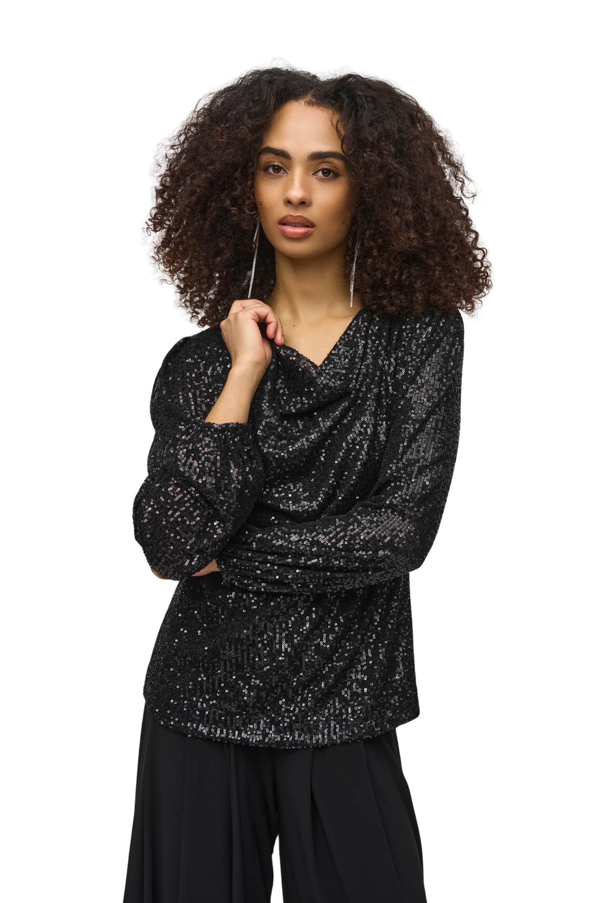 Ce top à sequins, d'un style fabuleux et décontracté, allie avec élégance classique et texture sophistiquée grâce à son col drapé. Il sublimera n'importe quelle tenue, qu'il soit porté avec un pantalon ou une jupe.