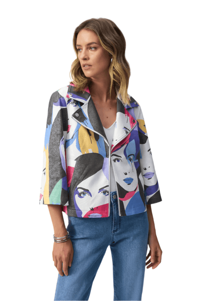 Affirmez votre style avec cette veste trapèze en suédine aux couleurs éclatantes. Ornée d'un imprimé abstrait représentant un visage, dotée d'un col cranté et de manches trois-quarts évasées, cette veste allie style et praticité.
