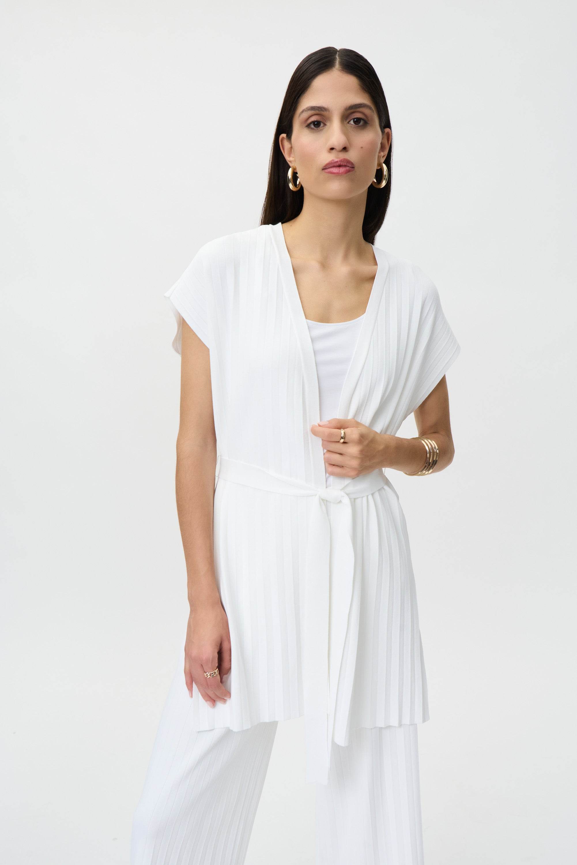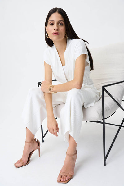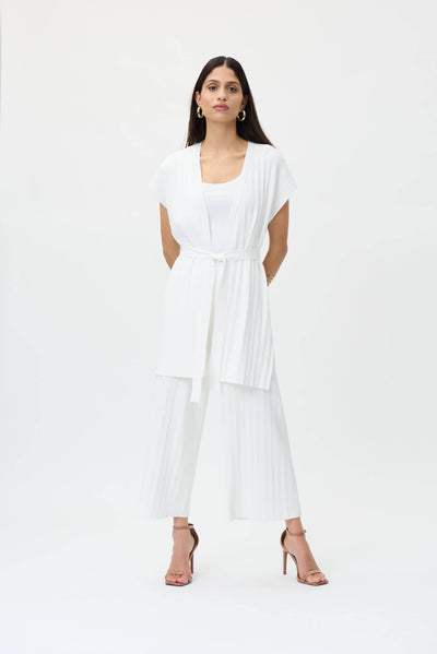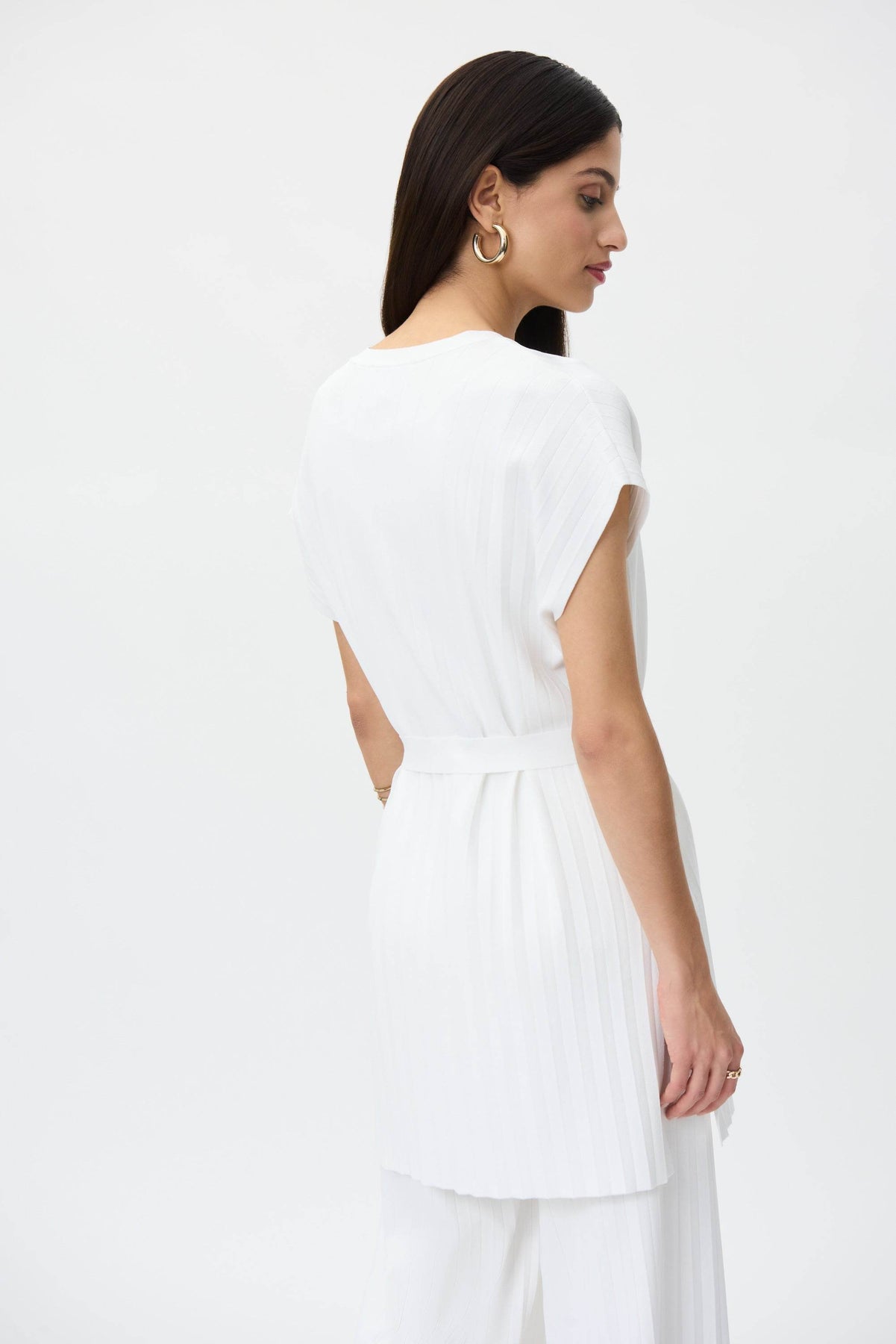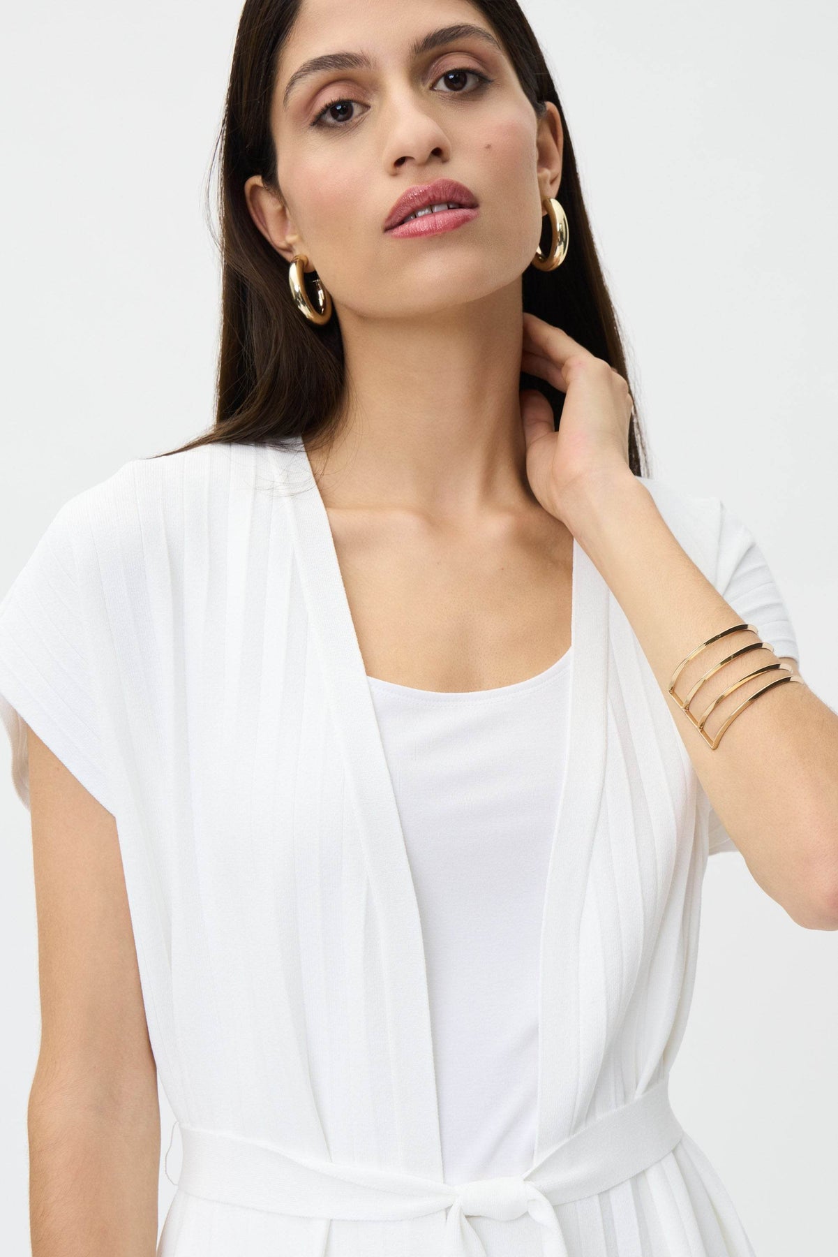Whoever said that the perfect Summer outfit doesn't exist, hasn't seen this beauty by Joseph Ribkoff! The Belted Cover-up Style 232928 brings all the fun and lightness of summer! The ideal cover-up to be worn over your swimsuit, with its plunging neckline, drapey and flowy fabric and belted waist that can be worn tied up or loose. Pair it with our Joseph Ribkoff Pleated Wide Leg Pants Style 232929 for the perfect beach outfit!