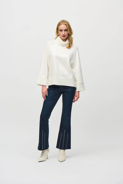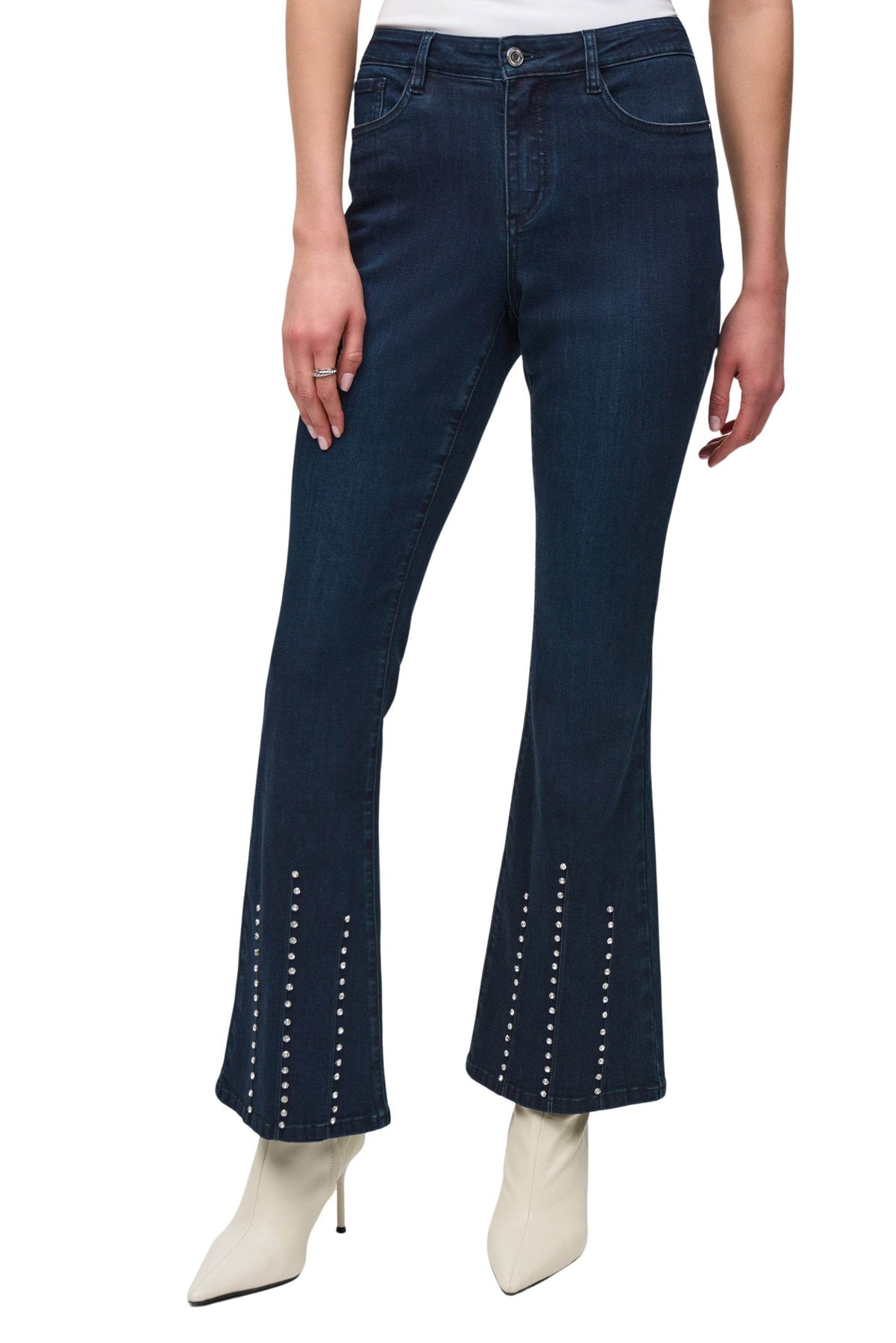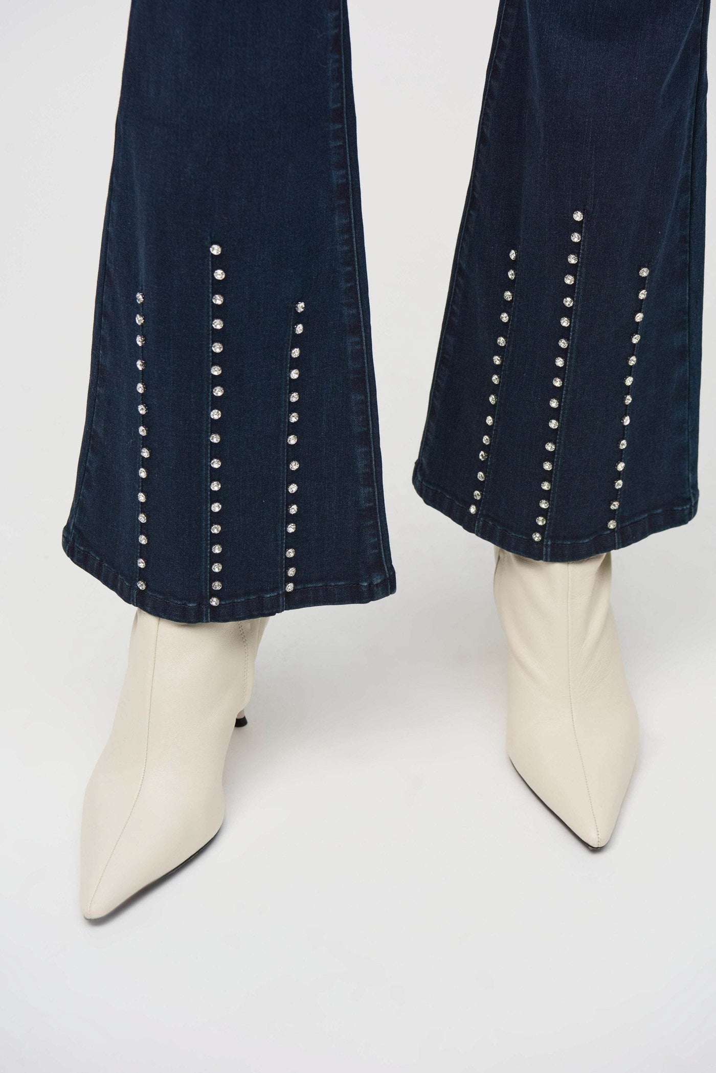 Stone rivets along the front leg infuse an edgy element into these enduring flared denim pants. Ideal for casual outings or a night on the town, they effortlessly elevate any ensemble with their timeless style and versatile flair.