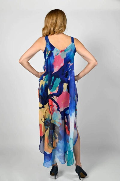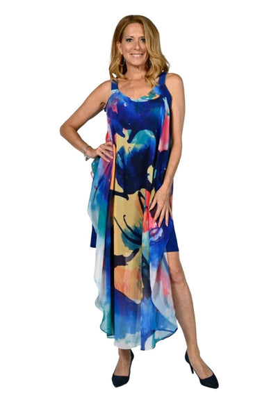 Bold with its vibrant, eye-catching hues and floral motif, this Frank Lyman dress is the ideal summer or vacation style. It's cut with a semi-rounded neckline and drapey silhouette that hits at the ankle. Its rounded hem exposes a peek of leg, perfect for a dinner down by the water. Finish the look with heels or sandals.