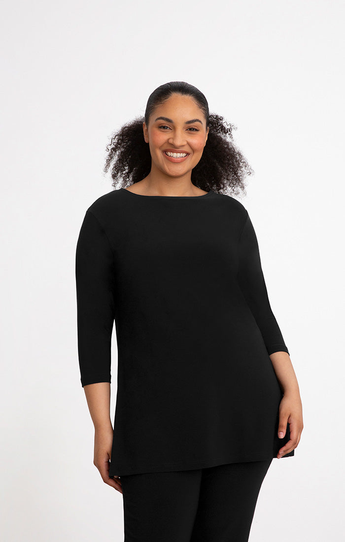 The Sympli Nu Ideal Tunic 3/4 Sleeves, is a sumptuous piece with a fluid fabric that allows a beautiful swing. Features a high rounded neckline and side slits for an effortless drape and silhouette. This is simply the ideal tunic!