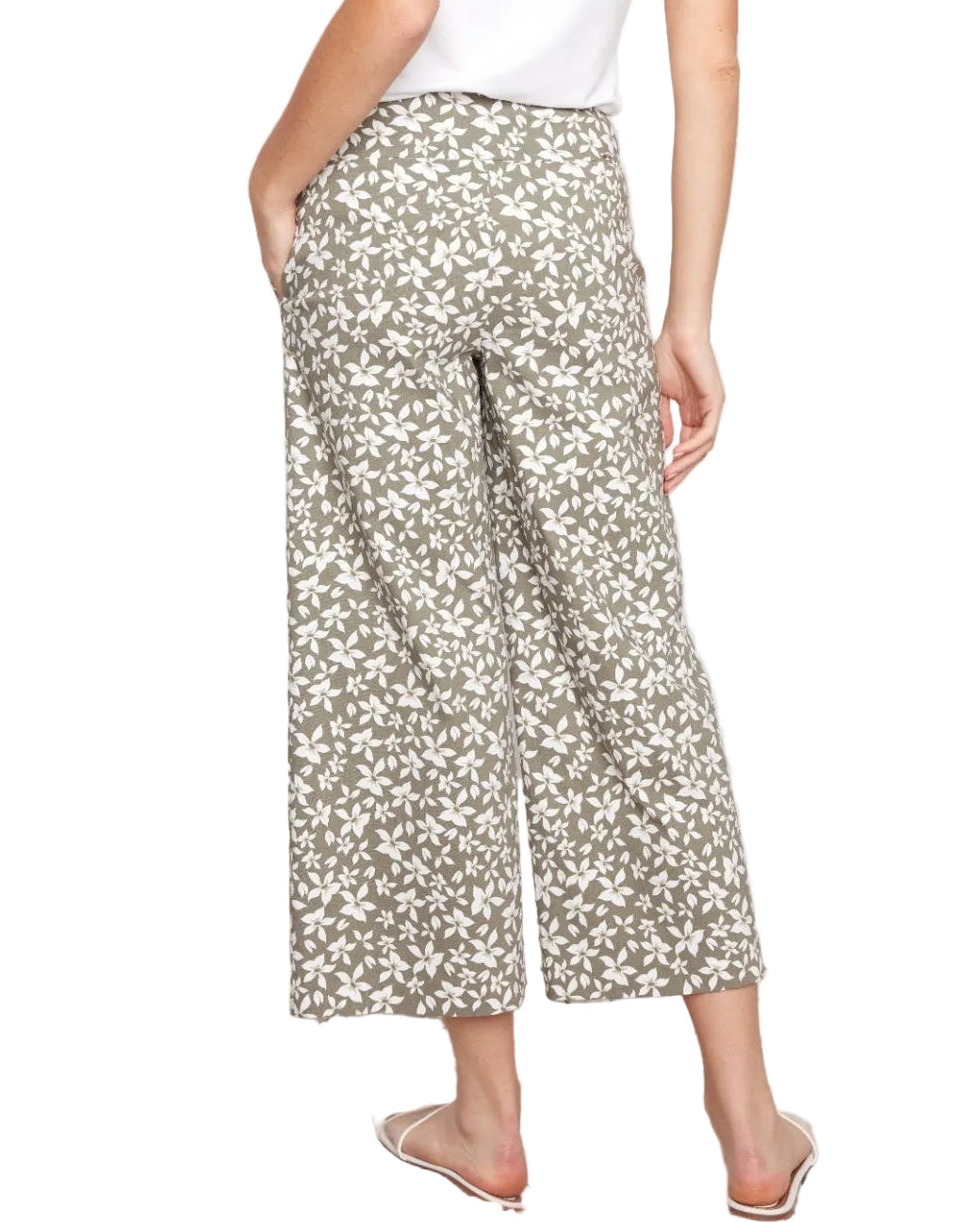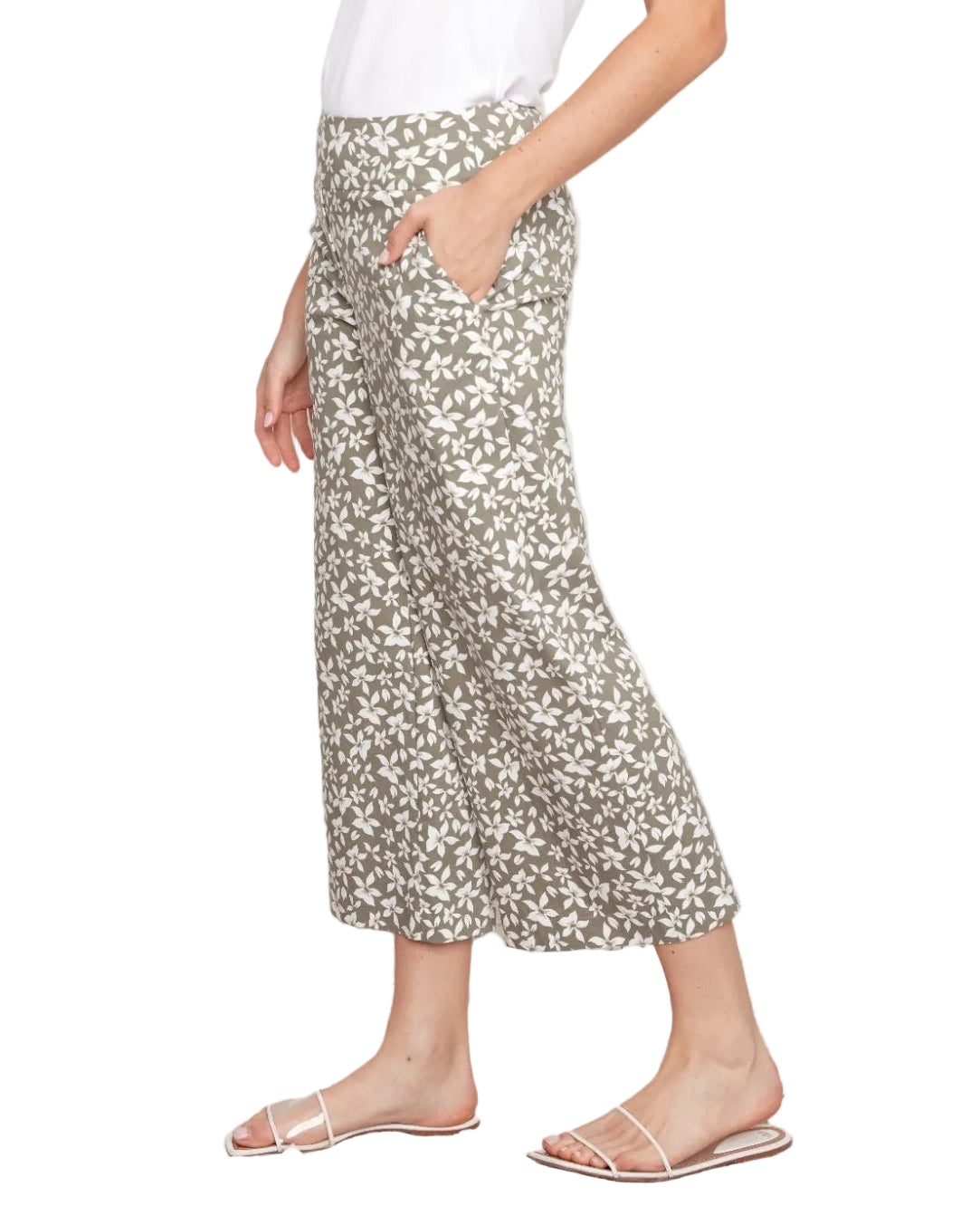A sage green meets timeless style with the Dream Pants Wide Leg Cropped Pull-On. Delicate white daisy flowers dance across the fabric, bringing fresh spring energy to your wardrobe. The cropped 25" inseam hits just right for a modern silhouette, while two front pockets add everyday practicality. Built with pull-on comfort and gentle tummy control, this piece features a breathable viscose blend that moves with you. The wide leg opening creates an effortlessly chic look perfect for pairing with sneakers or sandals. Ideal for spring and summer, these versatile pants transition seamlessly from casual outings to relaxed weekend wear. 100% Satisfaction Guaranteed — if it's not perfect for you, we'll cover return shipping and offer a full refund.