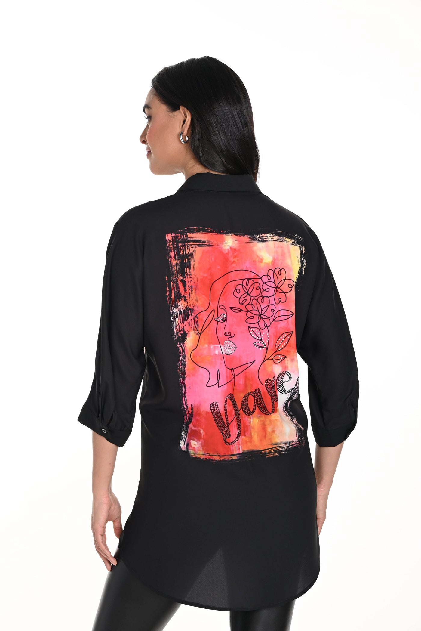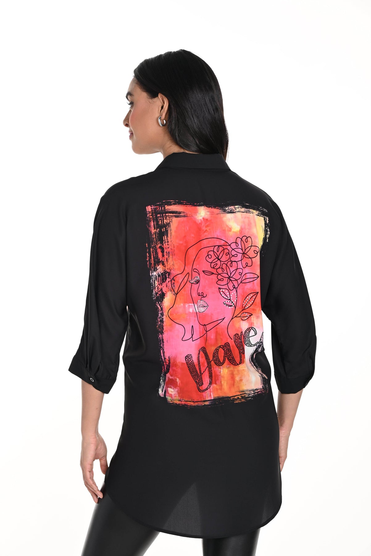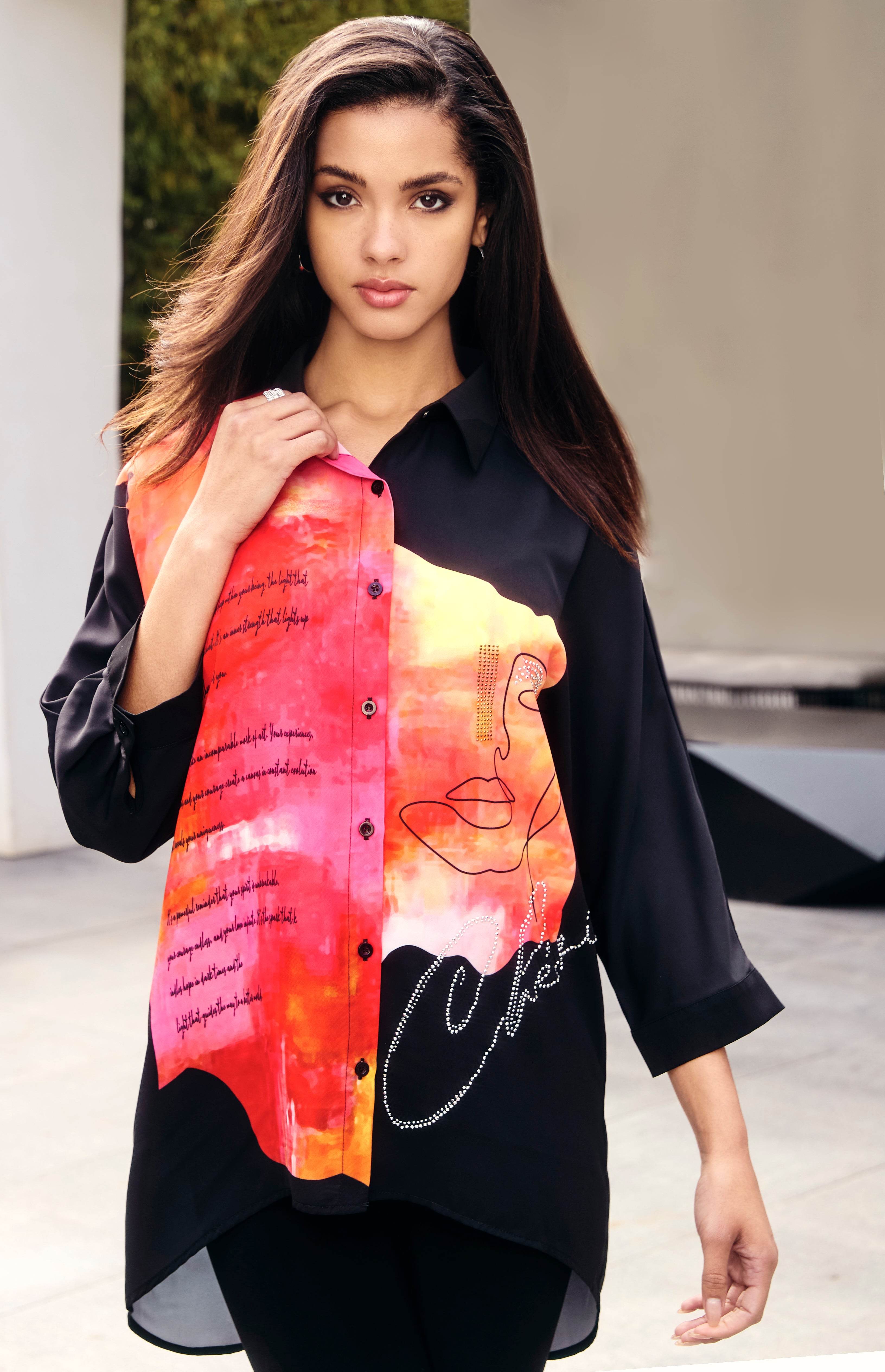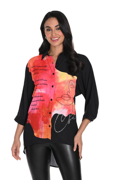 Elevate your wardrobe with the striking face print of this Frank Lyman black/orange blouse. Rhinestone accents and distinctive verbiage add a touch of opulence and character to any outfit, making this piece a truly luxurious addition to your collection.