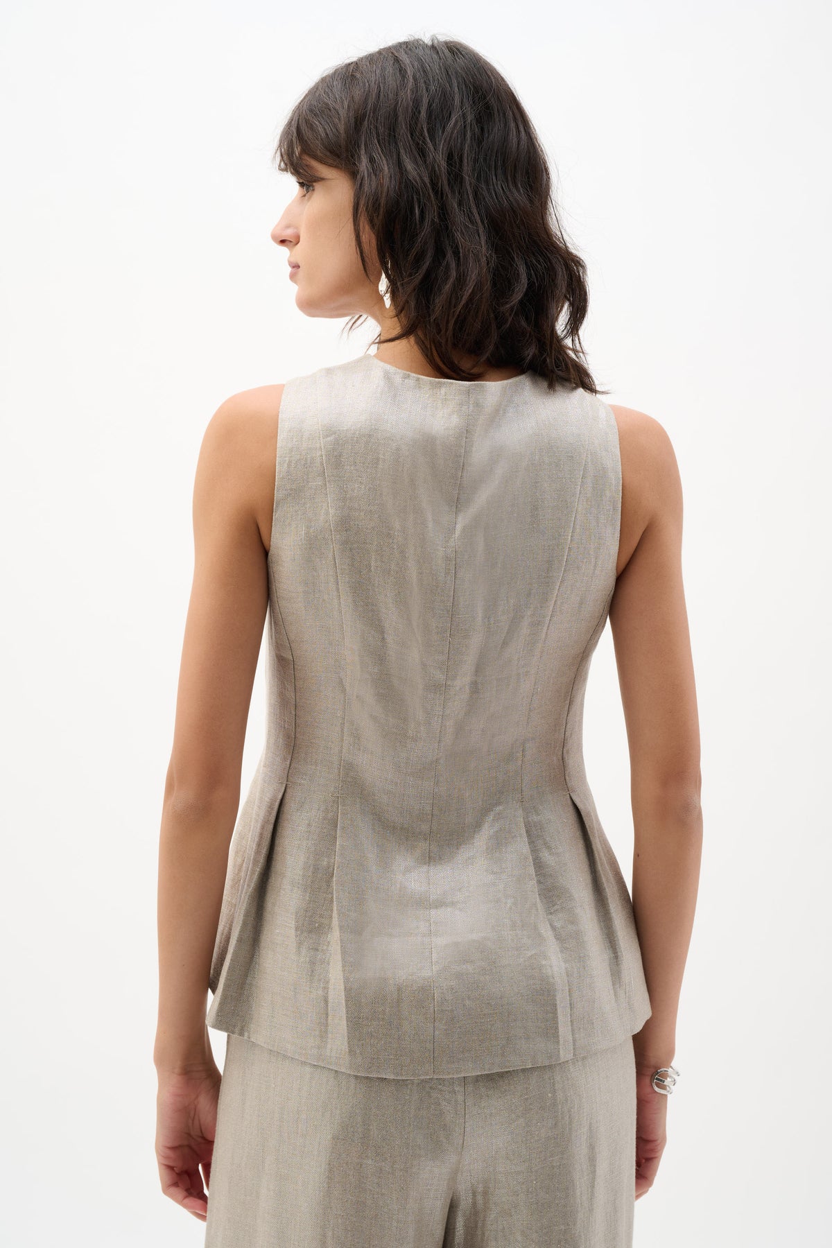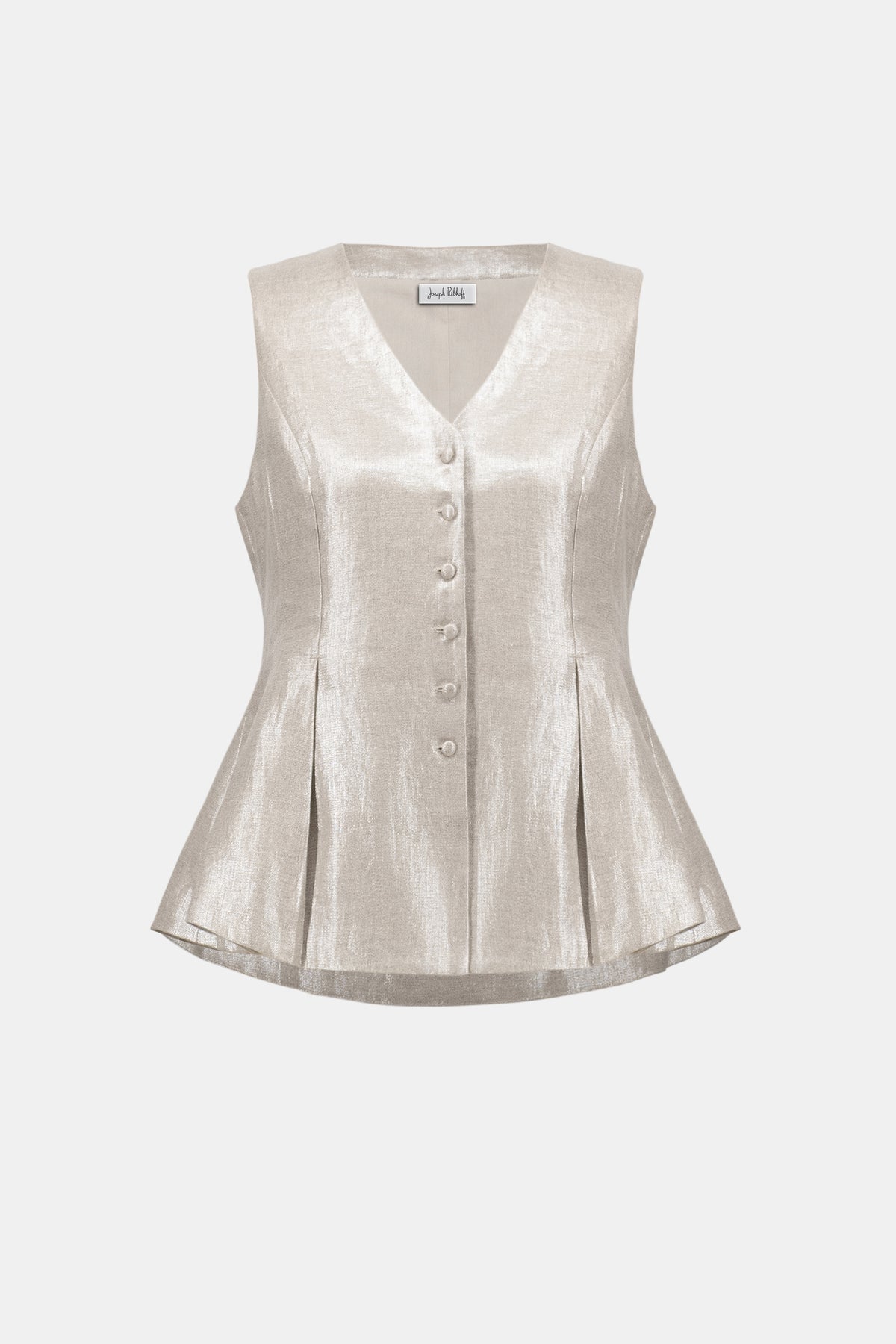 Elevate your wardrobe with this foiled linen peplum vest. The shimmering finish and flattering peplum silhouette create an instantly polished look, while the V-neckline adds sophistication. Perfect for layering over dresses or pairing with tailored trousers, this versatile piece transitions seamlessly from day to night.