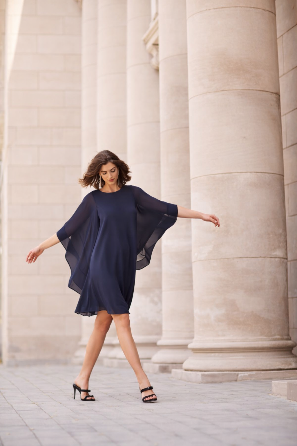 This chiffon dress combines understated luxury with wearable comfort. Cape-inspired sleeves and a fluid A-line cut create an instantly polished look, while the airy layered fabric moves gracefully with you. Whether you're attending a wedding or evening event, this piece delivers timeless sophistication without sacrificing ease.