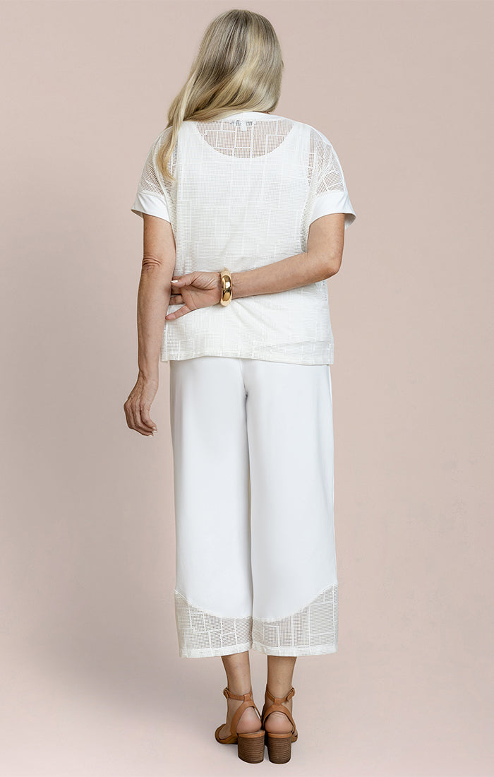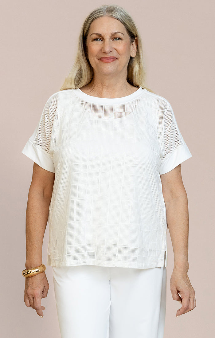 Elevate your evening style with this sophisticated sheer overlay top. Designed with a relaxed silhouette, this piece features a lightweight mesh layer adorned with subtle geometric detailing that adds texture and dimension. The soft short sleeves and easy drape create a flattering, comfortable fit, while the opaque lining ensures effortless wear. Perfect for pairing with dress pants or skirts, this elegant top transitions seamlessly from dinner events to special occasions with refined, modern charm.