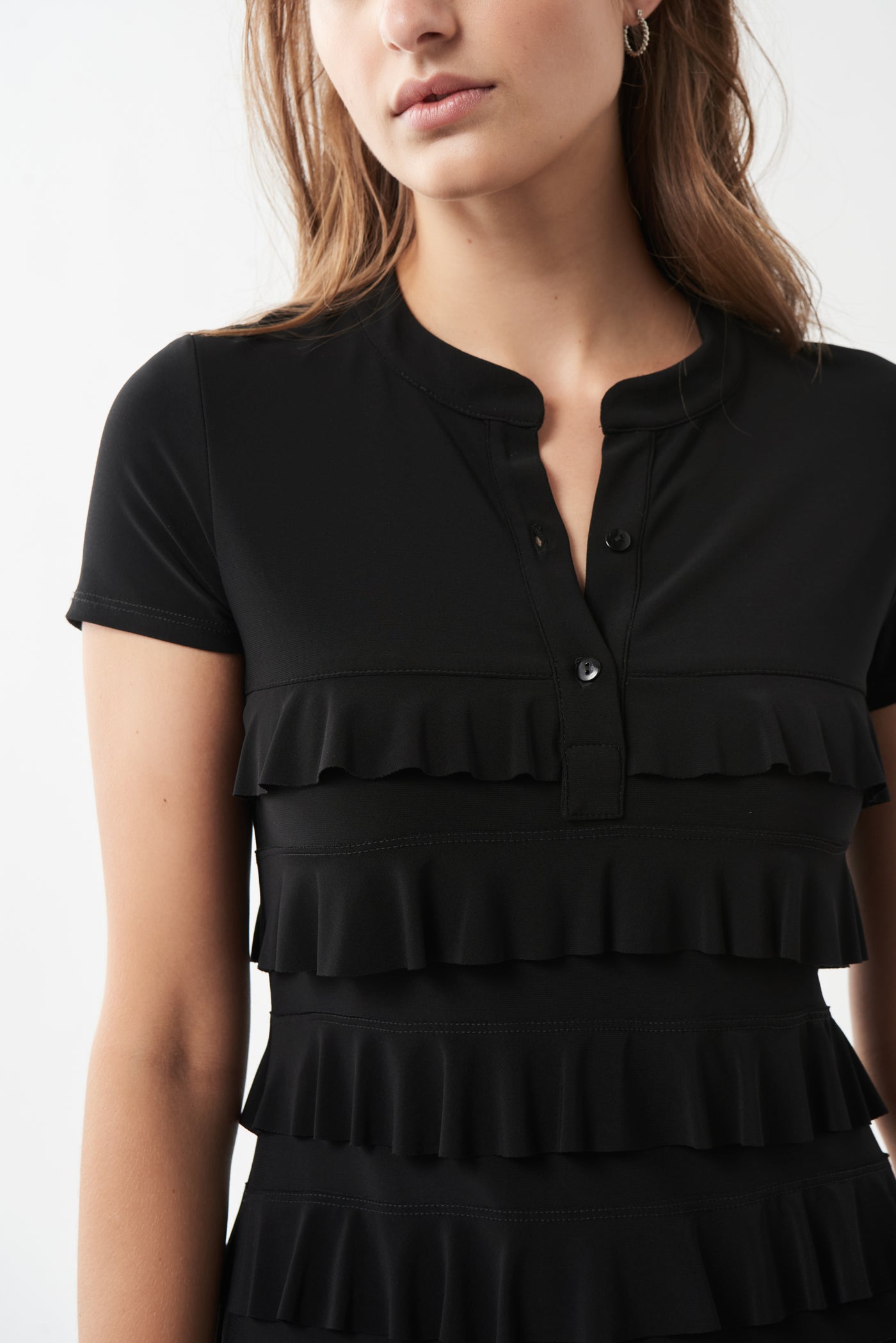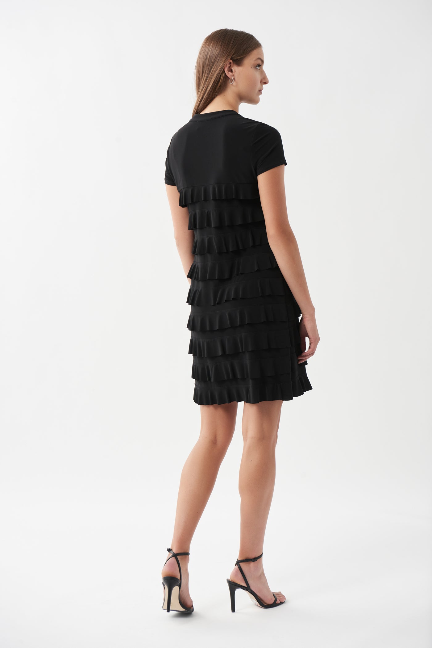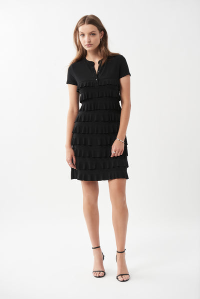 The Joseph Ribkoff Dress, Style 211350, is a beautiful staple for your wardrobe! This short sleeve dress features a ruffle layered look, a button-up collar, and a hemline that stops right above the knee. This fun dress is just what your wardrobe needs this spring.