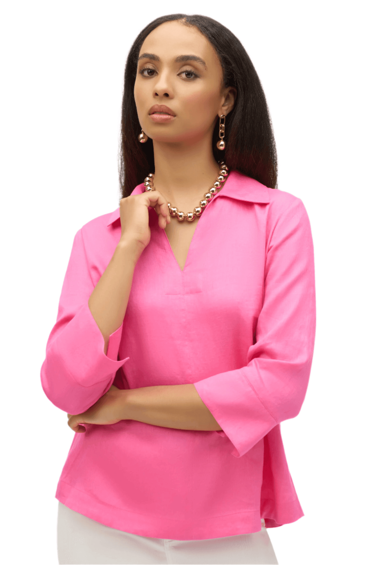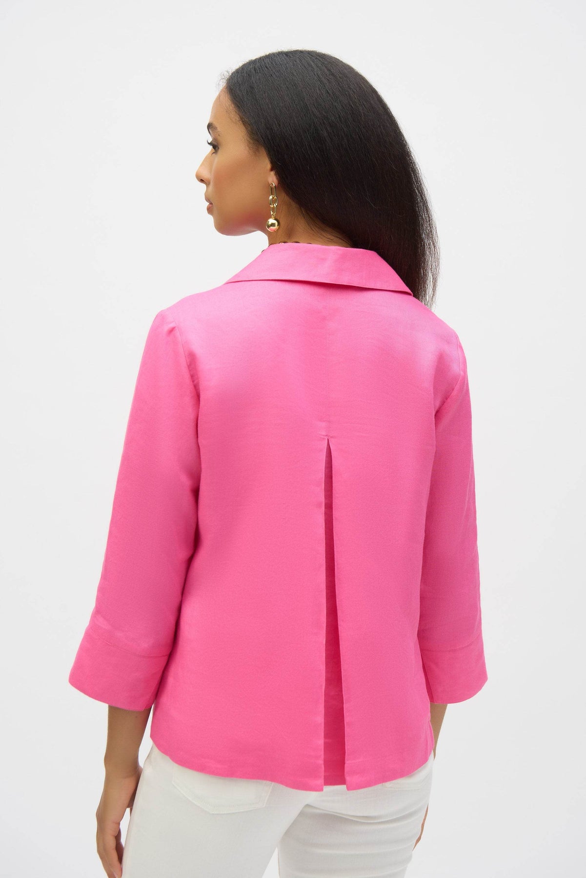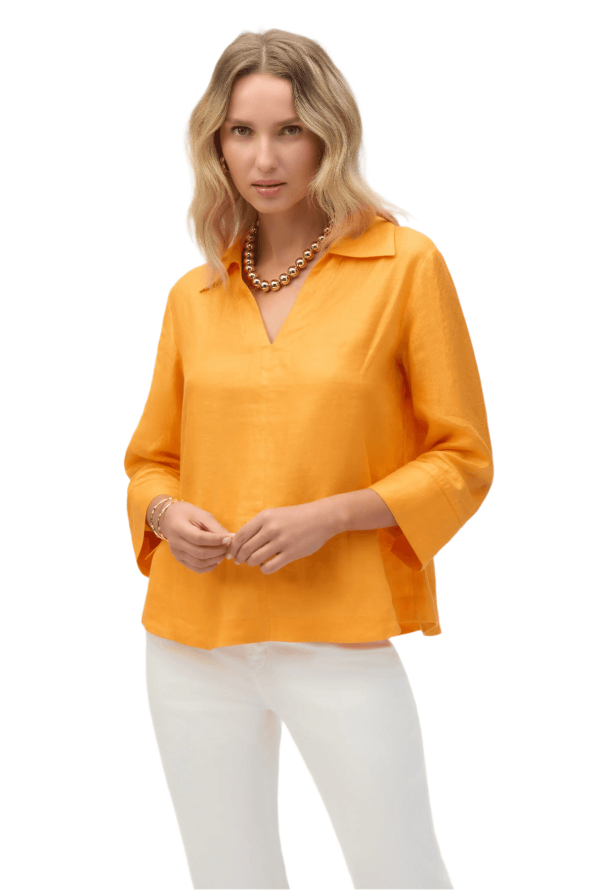 This top is made from a breathable and lightweight linen fabric, providing both comfort and style. Its understated details, such as the polo-esque shirt collar, crossover slit at the cuffs, and soft back pleat, make it stand out and are sure to be loved.
