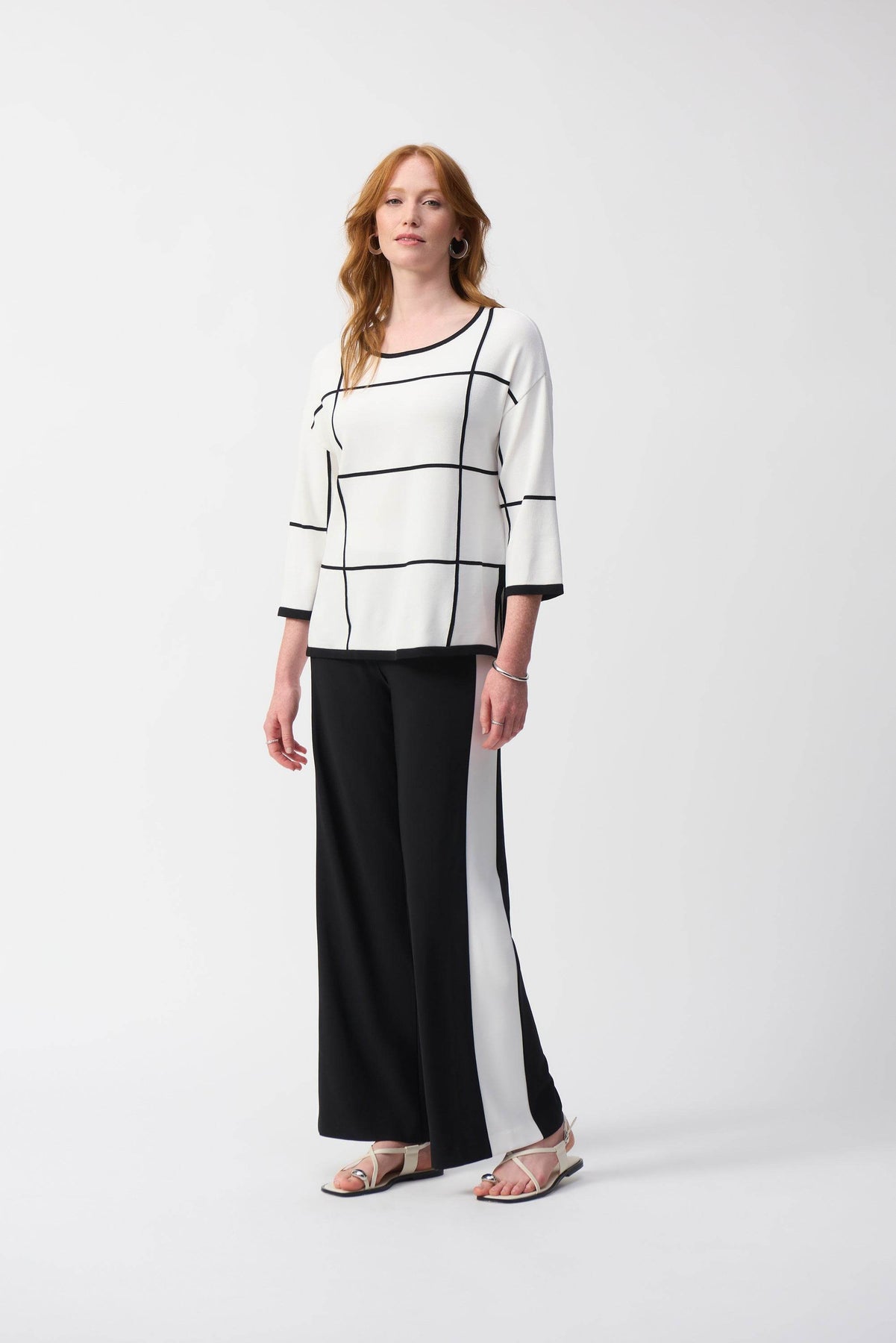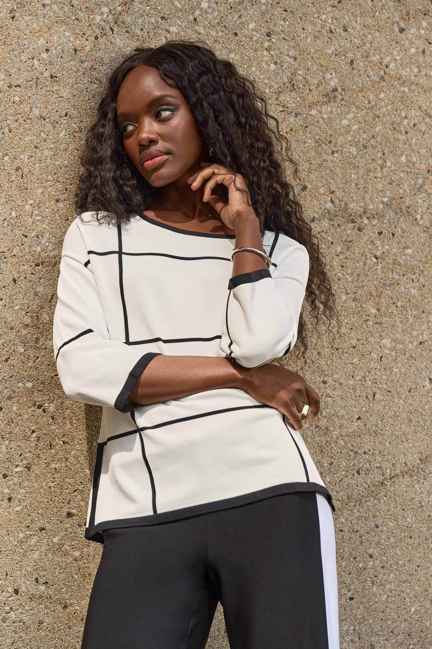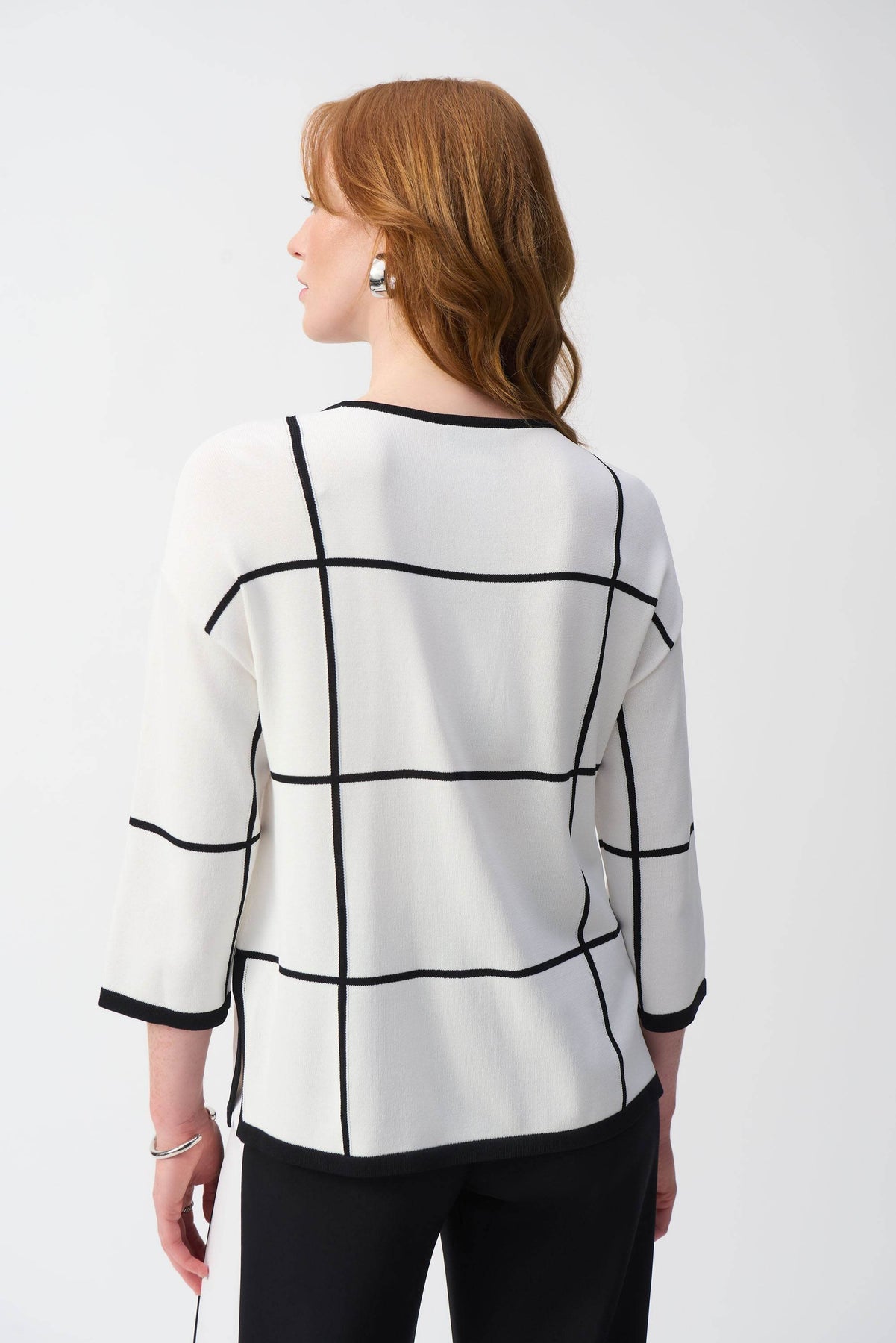 Featuring a contemporary dual-tone plaid design and lightweight sweater knit material, this top is perfect for daily wear. With a comfortable crewneck, three-quarter sleeves, and side slits, this versatile piece is both stylish and cozy.
